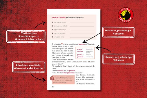 Eine Sprache auffrischen, motiviert und erfolgreich Vokabeln beziehungsweise Grammatik lernen und verstehen? Dafür sind die Lernkrimis Italienisch genau das Richtige. Sie bieten spannende, mitreißende Geschichten, dem jeweiligen Sprachniveau angemessene Übungen und kompaktes Wissen zu Sprache, Land und Leuten – und gleichzeitig eine Menge Lesespaß.