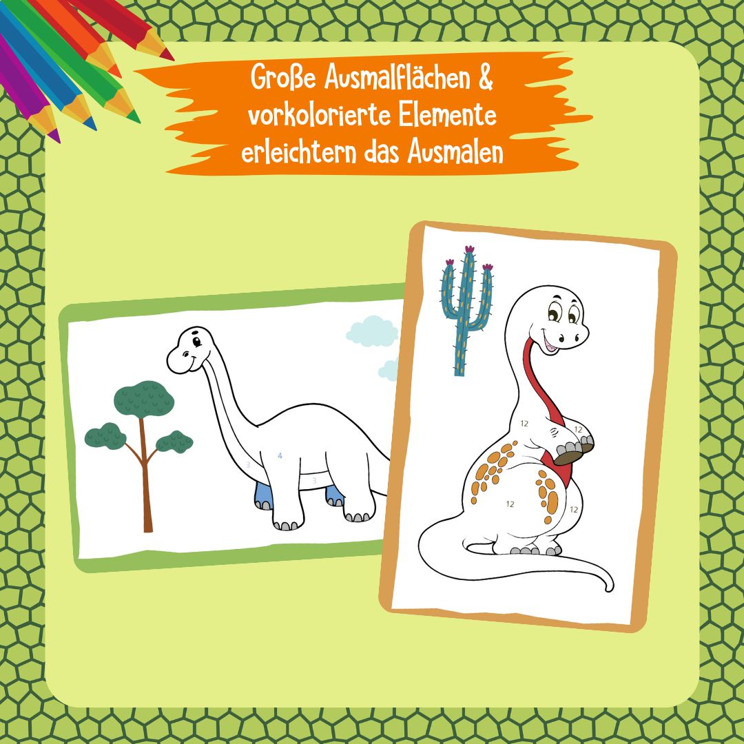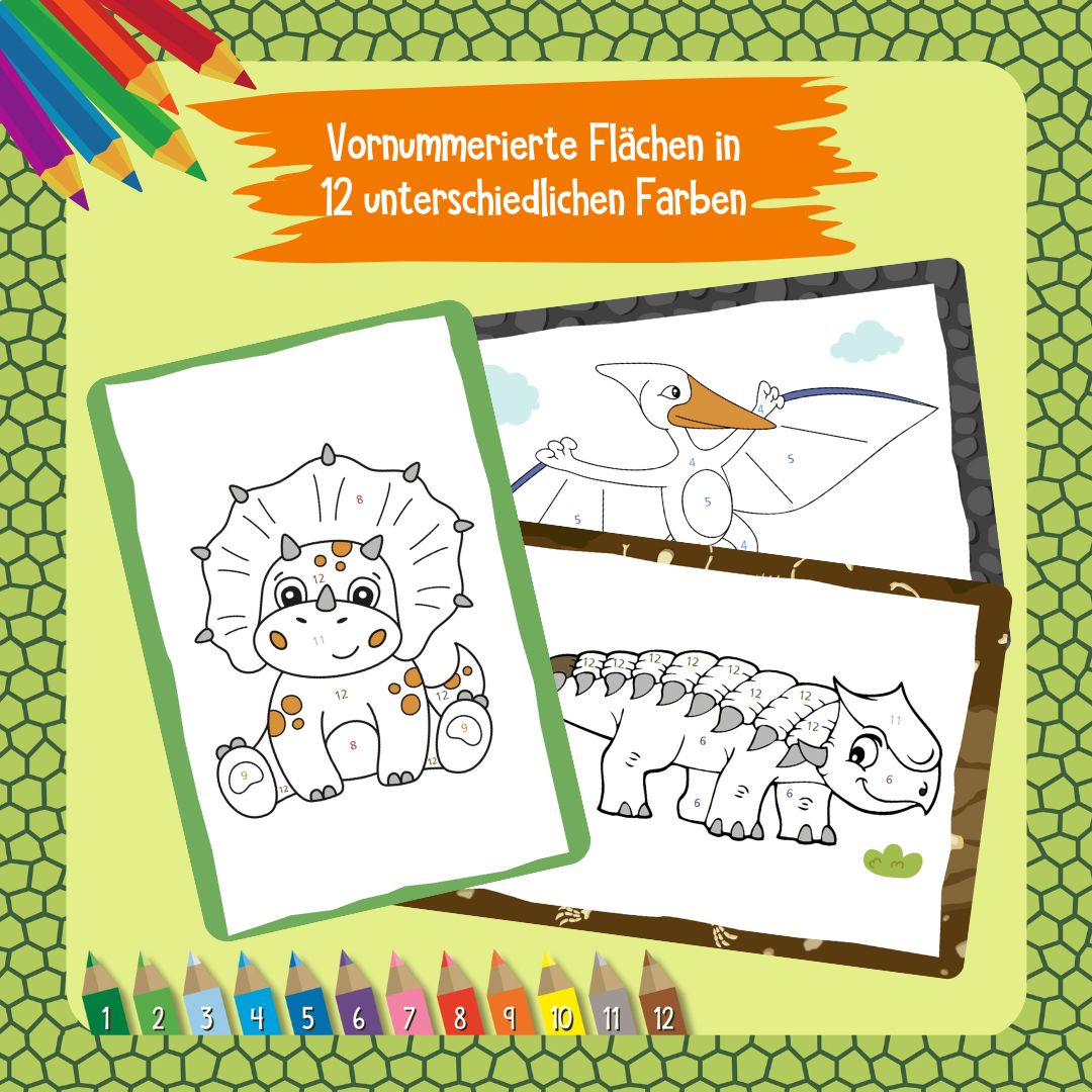 - 50 Karten voller aufregender Dinosaurier: Auf jeder Vorderseite findet sich ein Bild, das nach einem altersgerechten Malen-nach-Zahlen-Prinzip ausgemalt werden kann. Die 12 verschiedenen Farbnummern lassen am Ende kunterbunte Dino-Bilder entstehen.