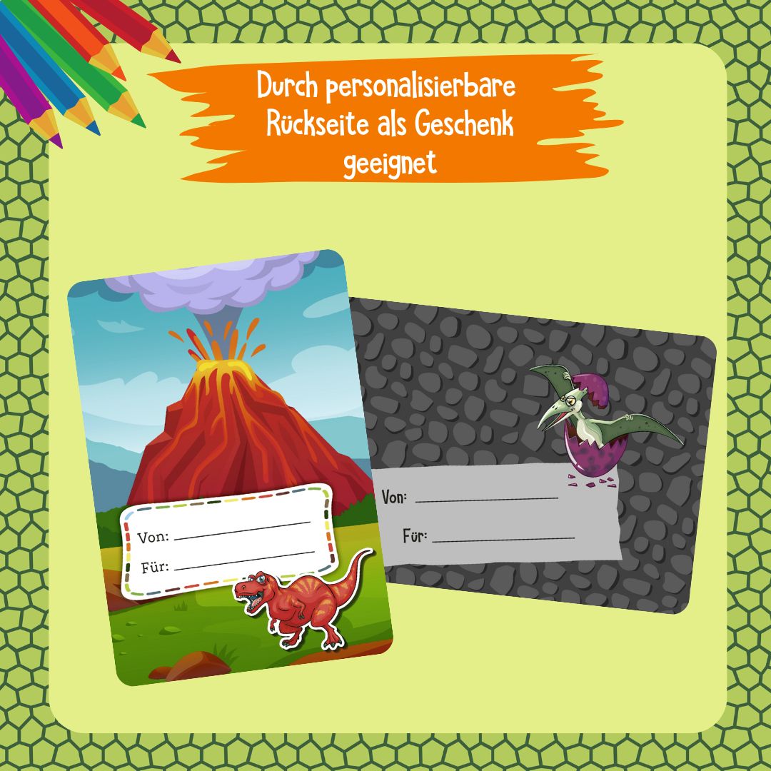 Egal ob Brachiosaurus, T-Rex oder Triceratops – Kleine Kinderhände zaubern aus den Ausmalkarten kunterbunte Meisterwerke, die sich perfekt zum Verschenken eignen. Auf jeder Kartenrückseite befindet sich ein Widmungsfeld, in das der Name der kleinen Künstlerin oder des kleinen Künstlers sowie der beschenkten Person eingetragen werden kann. Über dieses individuell gestaltete Mitbringsel freuen sich Familienmitglieder, Freunde und vor allem Dinosaurierfans garantiert.