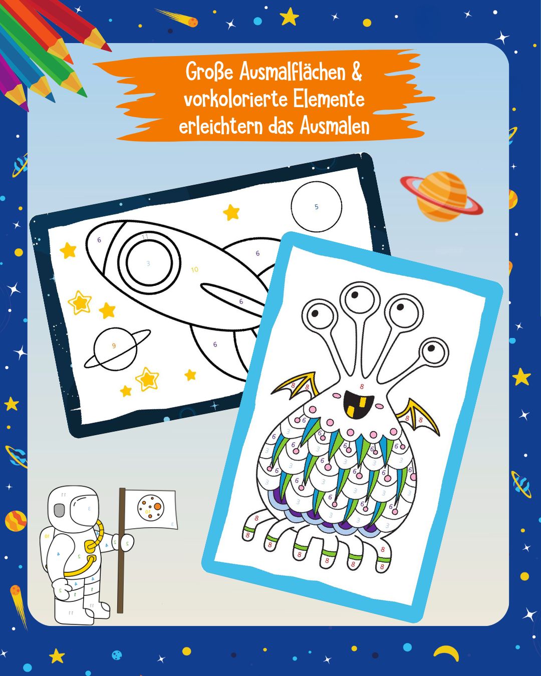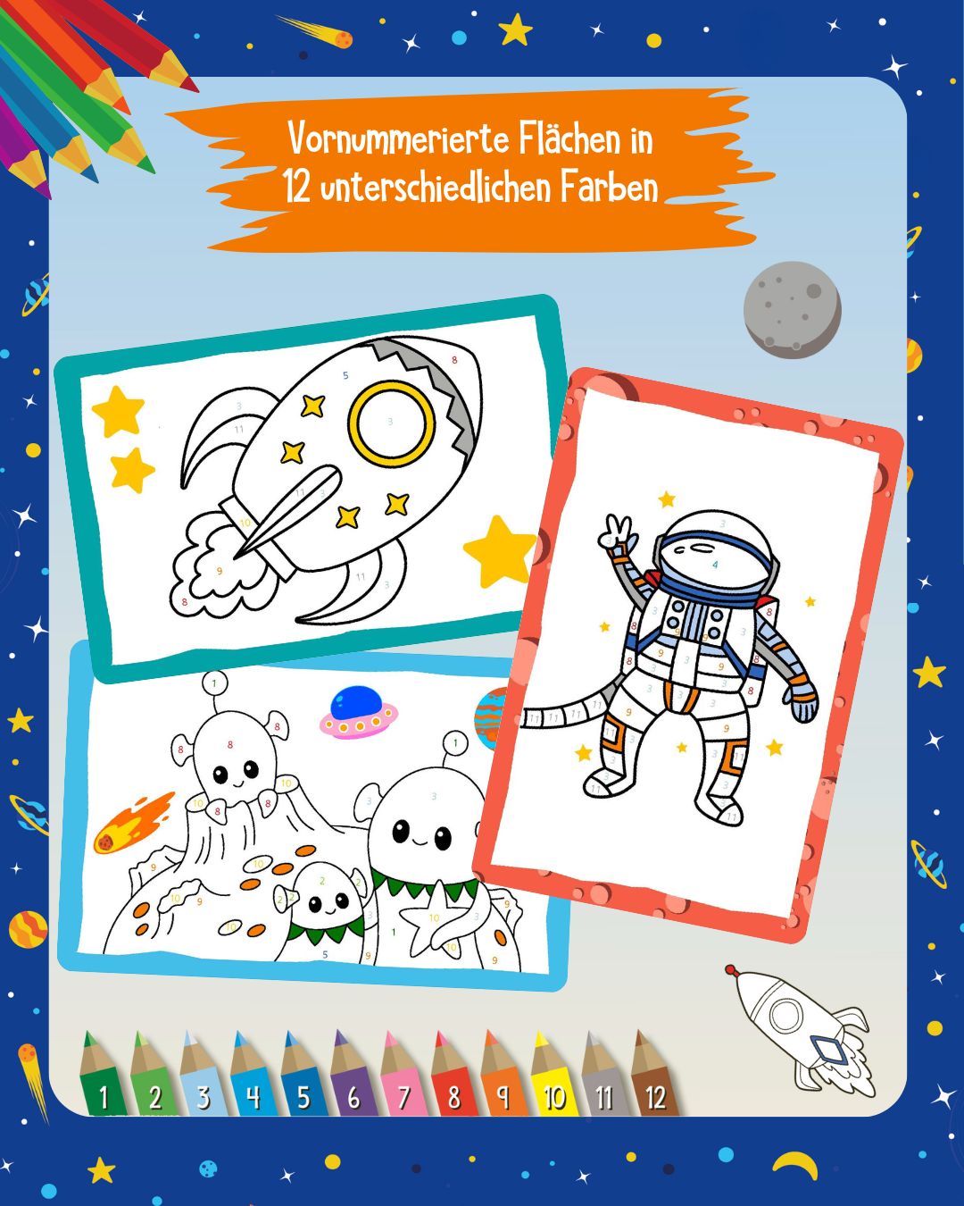 - 50 Karten voller aufregender galaktischer Motive: Auf jeder Vorderseite findet sich ein Bild, das nach dem altersgerechten Malen-nach-Zahlen-Prinzip ausgemalt werden kann. Die 12 verschiedenen Farbnummern lassen am Ende kunterbunte Weltraum-Bilder entstehen.