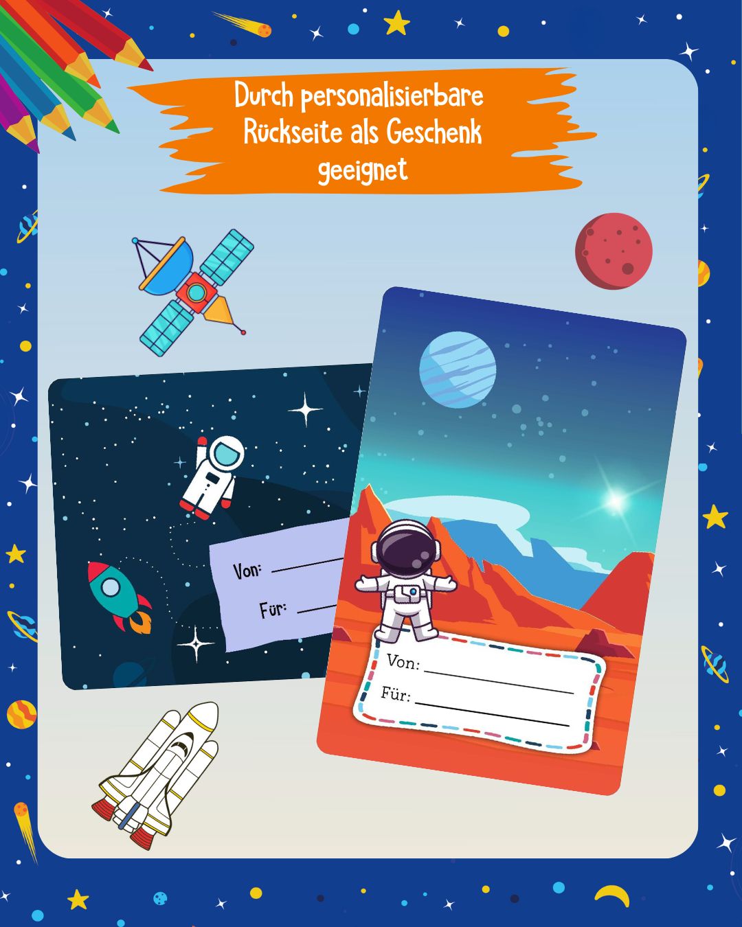 Egal ob beeindruckende Raketen, lustige Außerirdische oder ferne Himmelskörper – kleine Kinderhände zaubern aus den Ausmalkarten kunterbunte Meisterwerke, die sich perfekt zum Verschenken eignen. Auf jeder Kartenrückseite befindet sich ein Widmungsfeld, in das der Name der kleinen Künstlerin oder des kleinen Künstlers sowie der beschenkten Person eingetragen werden kann. Über dieses individuell gestaltete Mitbringsel freuen sich Familienmitglieder, Freunde und vor allem Fans der unendlichen Weiten des Weltalls garantiert.