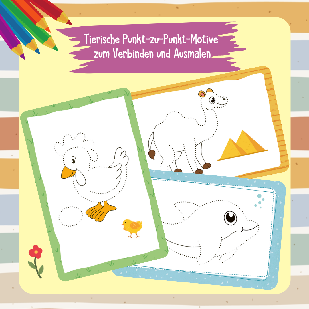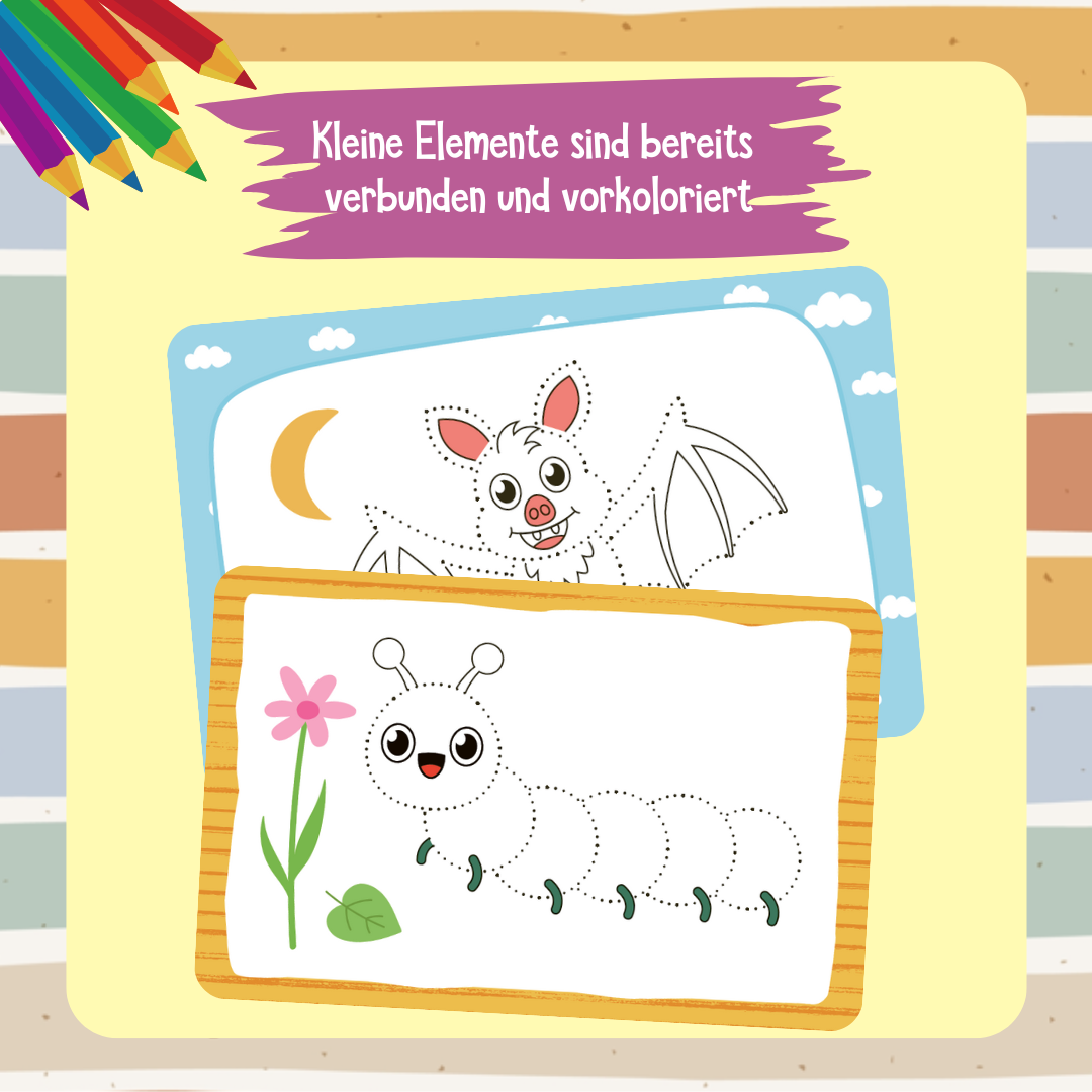 - Kreativer Ausmalspaß: Das Verbinden der Punkte fördert ganz nebenbei die Konzentrationsfähigkeit und Feinmotorik von Kindern. Erste Schwünge werden auf fantasievolle Weise geübt.