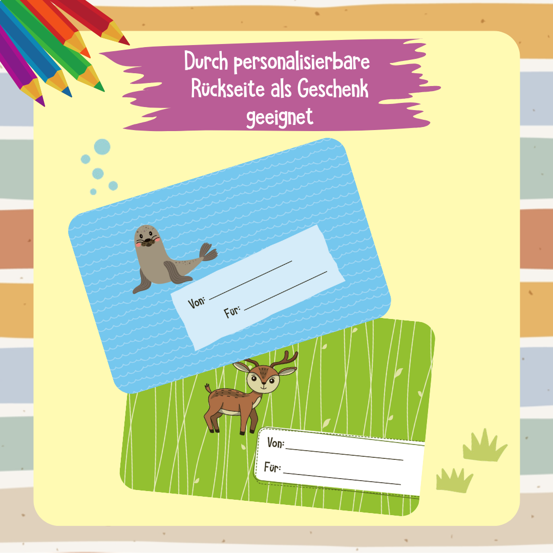 Egal ob Löwe, Wal oder Schmetterling – kleine Kinderhände zaubern aus den Ausmalkarten kunterbunte Meisterwerke, die sich perfekt zum Verschenken eignen. Auf jeder Kartenrückseite befindet sich ein Widmungsfeld, in das der Name der kleinen Künstlerin oder des kleinen Künstlers sowie der beschenkten Person eingetragen werden kann. Über dieses individuell gestaltete Mitbringsel freuen sich Familienmitglieder und Freunde garantiert.