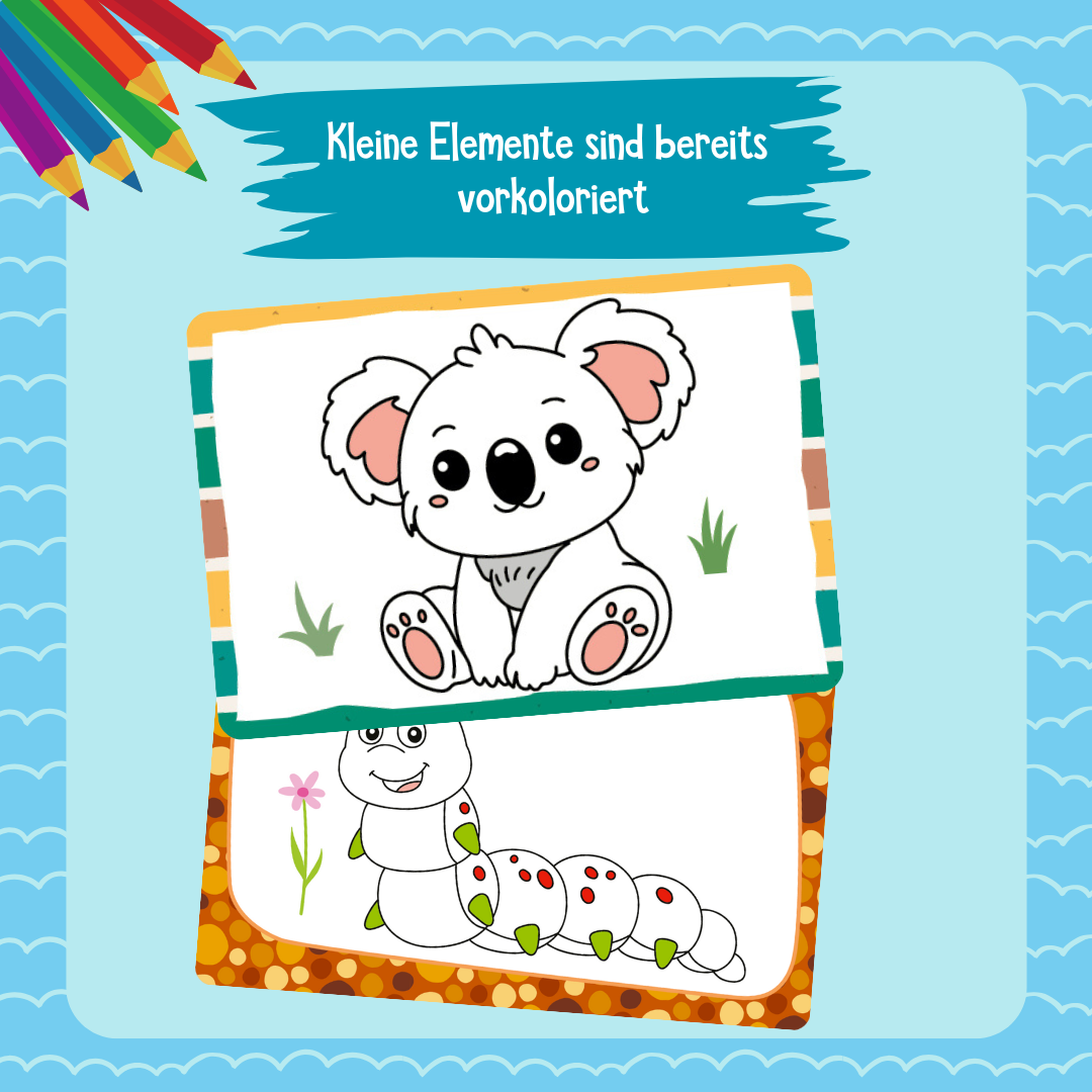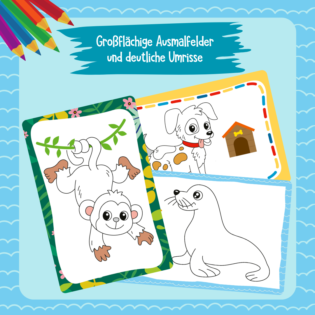 - 50 Karten voller zauberhafter Tier-Motive: Auf jeder Vorderseite findet sich ein altersgerechtes Bild mit großen Ausmalflächen und deutlichen Umrissen.
