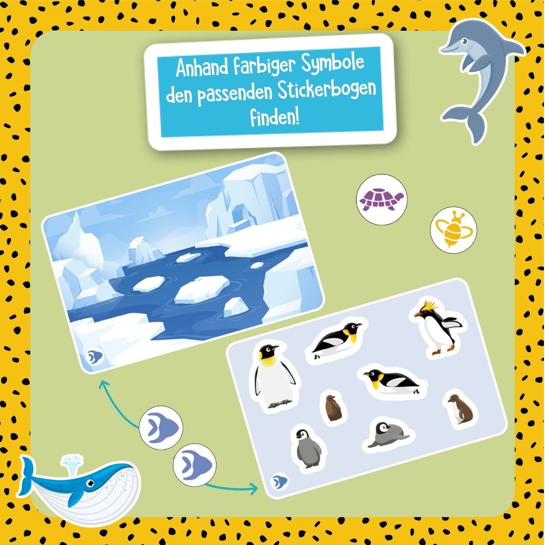 30 tierisch starke Karten voll mit verschiedenen Tiermotiven warten darauf von kleinen und großen Stickerliebhaber*innen beklebt zu werden! Die liebevoll gestalteten Mitmachkarten sorgen für viel Abwechslung und lassen Kinder ab 4 Jahren in die Tierwelt eintauchen. Hier wartet farbenfroher Stickerspaß mit allem, was das Herz der Kleinen höherschlagen lässt: Dschungeltiere werden in den Regenwald gestickert, Meeresbewohner schwimmen durchs Korallenriff, Bauernhoftiere sind auf grünen Wiesen unterwegs und im ewigen Eis trifft man auf Eisbär & Co. Die Kinder können neben freiem Stickern fehlende Teile in bunte Puzzles kleben oder bestickern Bilder, die dann noch fertig ausgemalt werden können. Durch die praktische Größe eignen sich die Stickerkarten in der Stülpdeckelschachtel ideal zum Mitnehmen und sind sowohl unterwegs als auch Zuhause eine unterhaltsame und unkomplizierte Beschäftigungsmöglichkeit. Die Kartensets können ganz einfach unter mehreren Kindern aufgeteilt werden und sorgen jederzeit für großen Stickerspaß!
