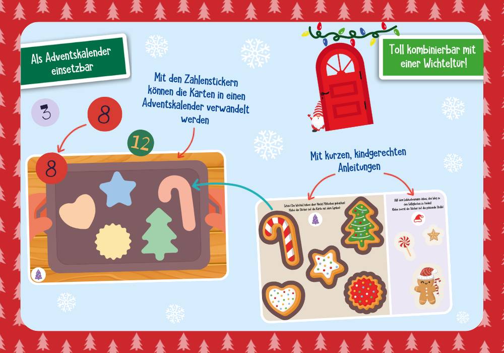 Das Kartenset ist so konzipiert, dass Kinder ab 4 Jahren entweder jeden Tag wie bei einem Adventskalender in ein zauberhaftes Wichtelabenteuer eintauchen können oder unabhängig davon nach Lust und Laune einfach drauf Losstickern können. Möglich machen dies extra Zahlen-Aufkleber, mit denen ohne viel Aufwand ein Adventskalender aus den Karten gebastelt werden kann. Sind die Adventsrätsel und Stickerszenen fertiggestellt, eignen sich die Karten perfekt als Weihnachtsgruß, denn die Kartenrückseiten sind als Grußkarte gestaltet, die man ausfüllen und verschenken kann. Über dieses individuell gestaltete Geschenk freuen sich Familienmitglieder und Freunde garantiert.
