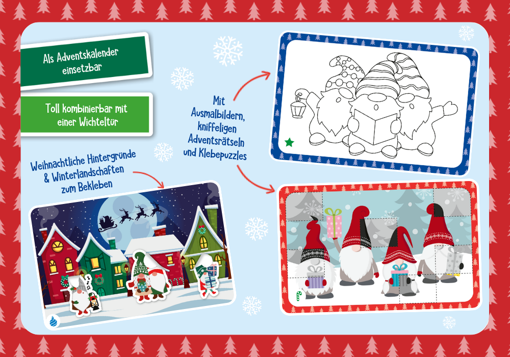 - 30 Karten voller bezaubernder Wichtelabenteuer: Auf jeder Vorderseite findet sich ein weihnachtlicher Hintergrund, ein farbenfrohes Puzzle, ein kniffliges (Zuordnungs-)Rätsel zum Bekleben oder ein (Sticker-)Bild zum (fertig) Ausmalen. Auch die eigenen Weihnachtswünsche dürfen auf die Wunschzettel-Karte gestickert werden!