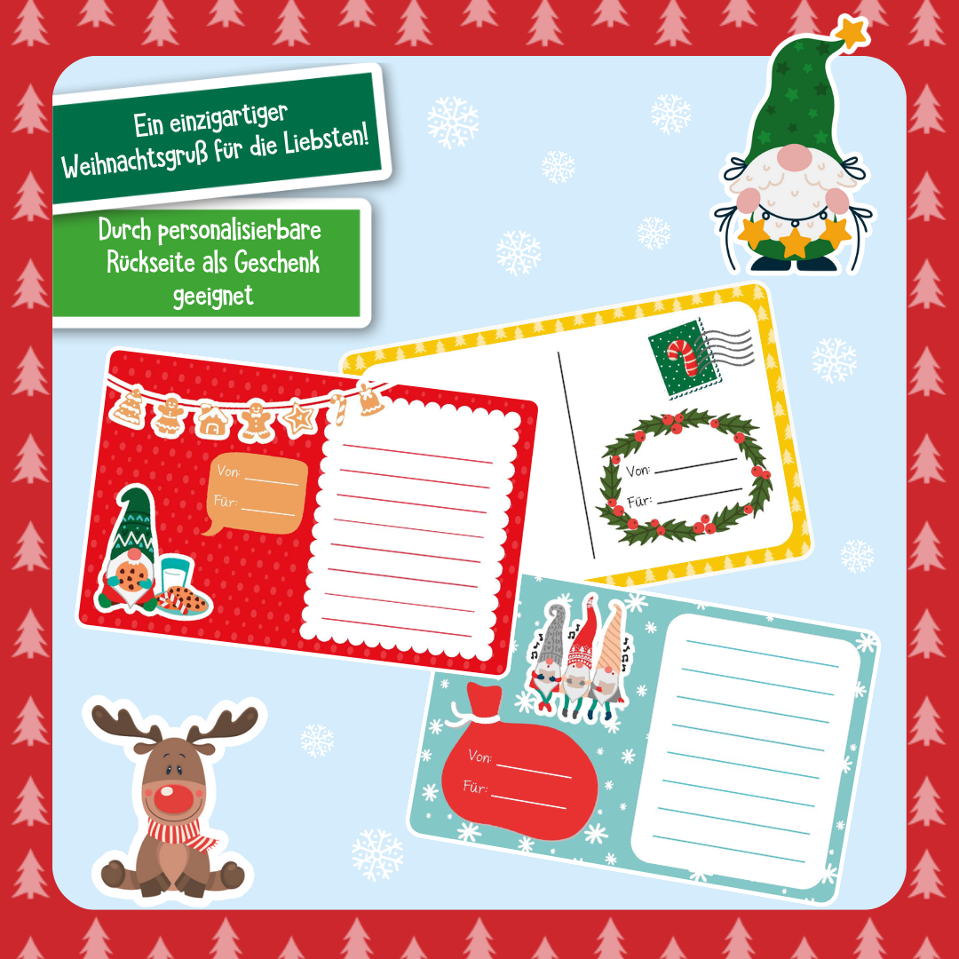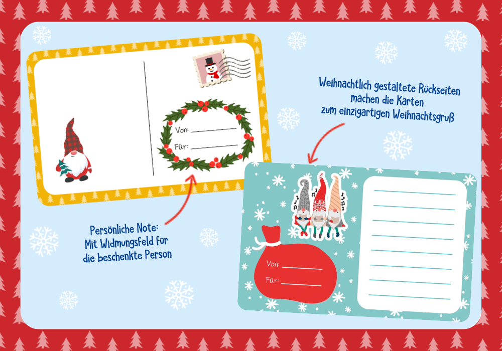 ... über die sich Familienmitglieder und Freunde garantiert freuen! Alle Kartenrückseiten sind im weihnachtlichen Stil gestaltet und haben ein Widmungsfeld. Einfach das Feld der fertigen Karten ausfüllen und die besonderen Weihnachtsgrüße sind fertig zum Verschenken!