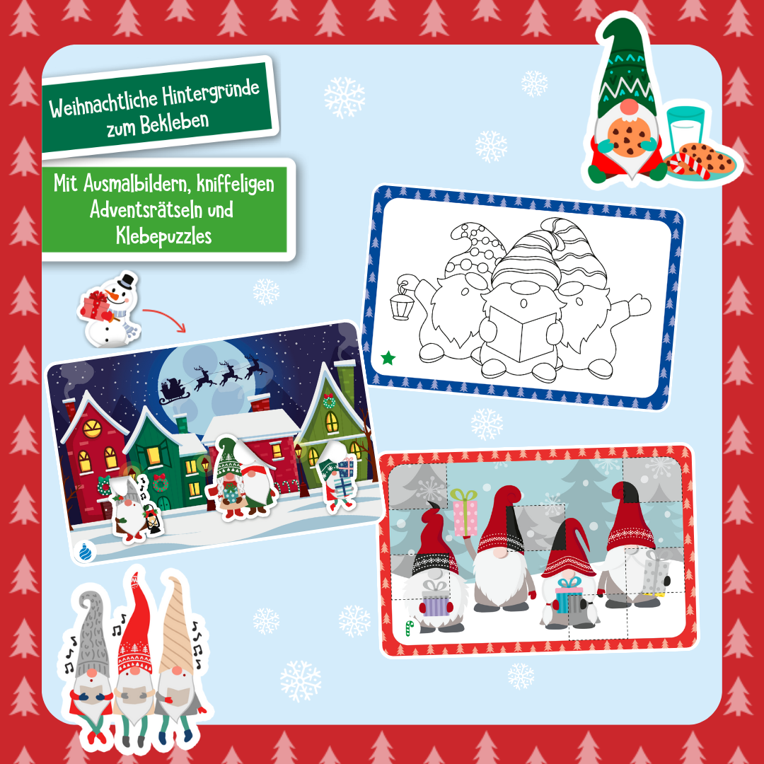 Hier werden Winterlandschaften und weihnachtliche Hintergründe bestickert! Es gilt Klebepuzzles zu vervollständigen, wie beispielsweise den Wichteln die richtigen Mützen zuzuordnen, und kniffelige Adventsrätsel wie Labyrinthe zu lösen. Tannenbäume oder ein Lebkuchenhaus werden mit Stickern verziert und fertig ausgemalt. Ein besonderes Highlight ist die Wunschzettel-Karte, die mit den eigenen Wünschen befüllt und anschließend bestickert werden kann! Kurze, kindgerechte Anleitungen auf dem Großteil der Stickerbögen erklären, was zu tun ist.