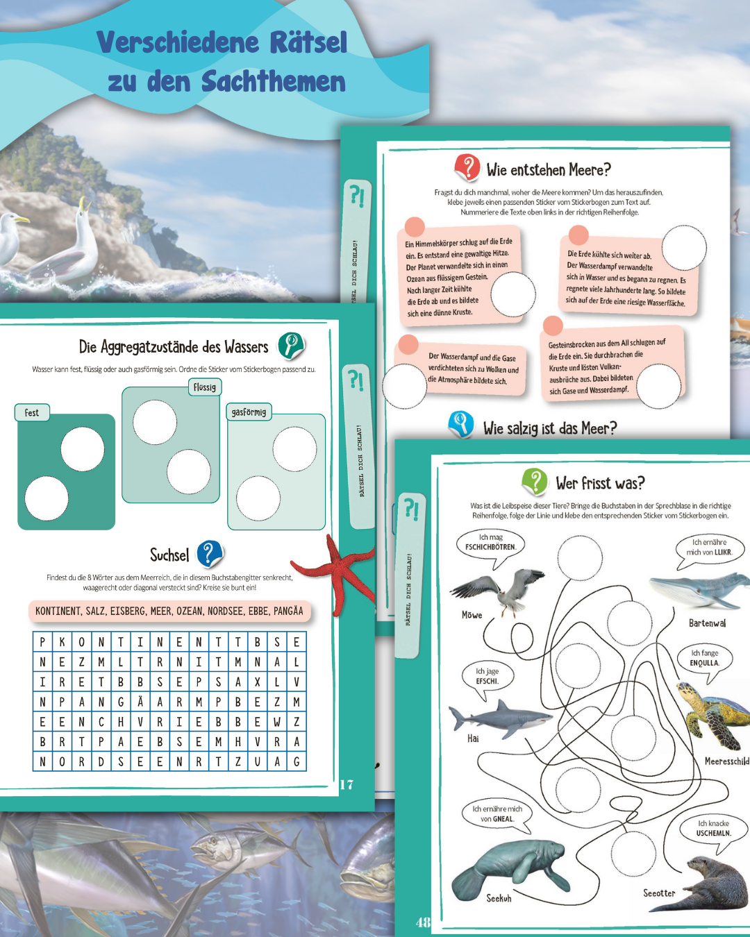 - Rätseln & Stickern: Die bunt gemischten Rätsel müssen auch mithilfe von Stickern gelöst werden.