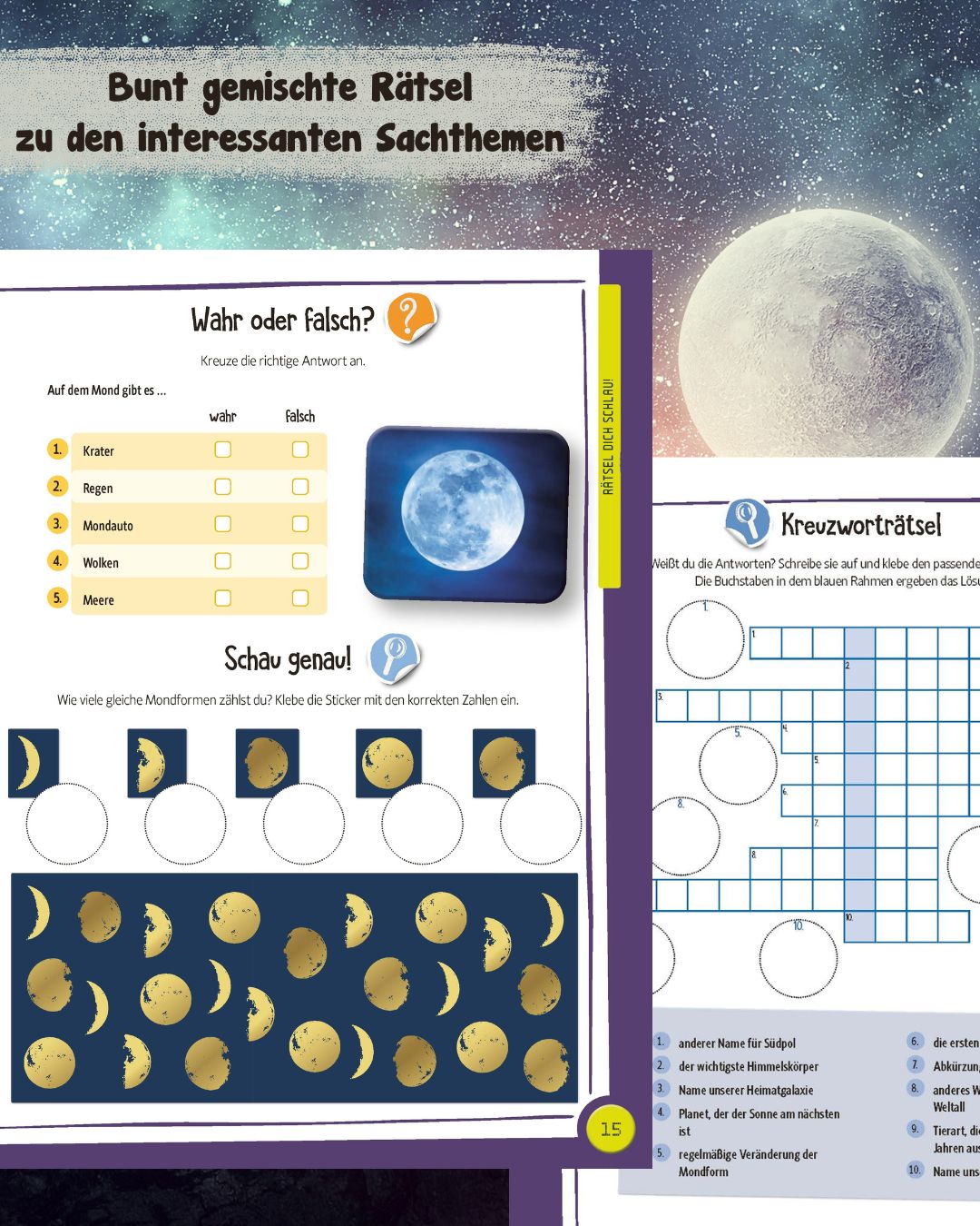 Auf geht’s zu einer spektakulären Expedition ins Weltall. Was ist die Milchstraße? Gibt es Außerirdische? Wie weit ist die Sonne entfernt? Mithilfe von kurzweiligen Sachtexten erfahren Kinder ab 8 Jahren alles über riesige Himmelskörper, ferne Galaxien und die spannenden Aufgaben eines Astronauten. Und das Beste ist: Im Anschluss an das interessante Sachwissen darf zum Lieblingsthema nach Herzenslust gerätselt und gestickert werden.