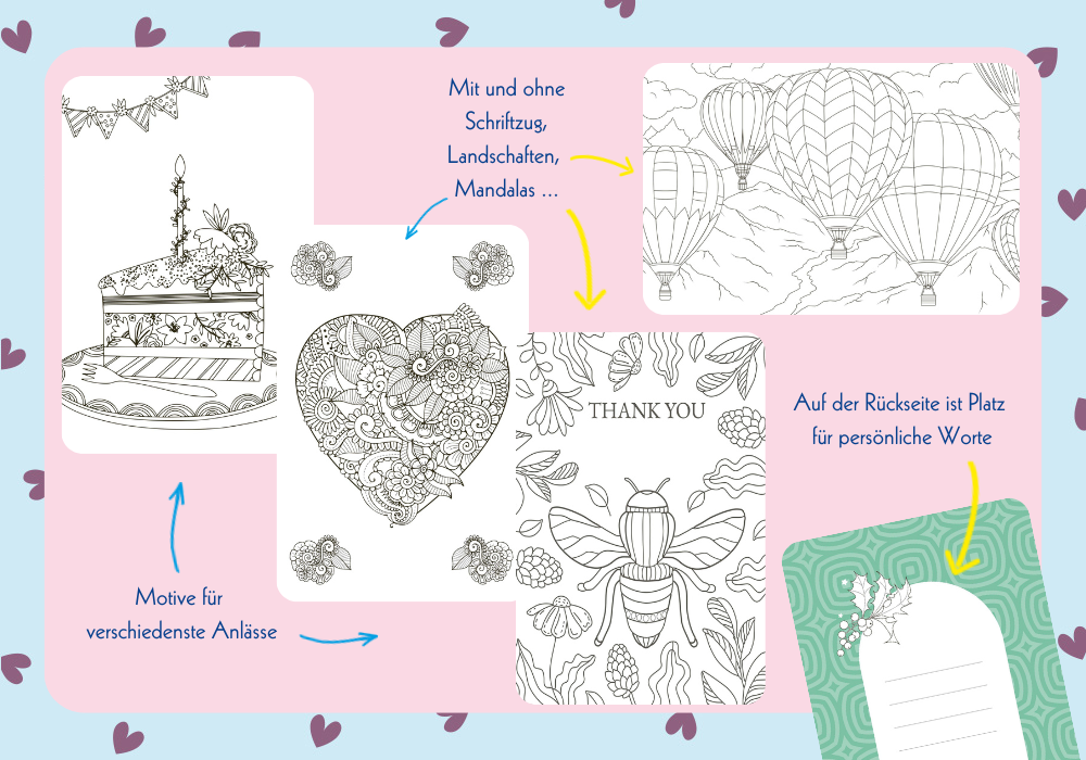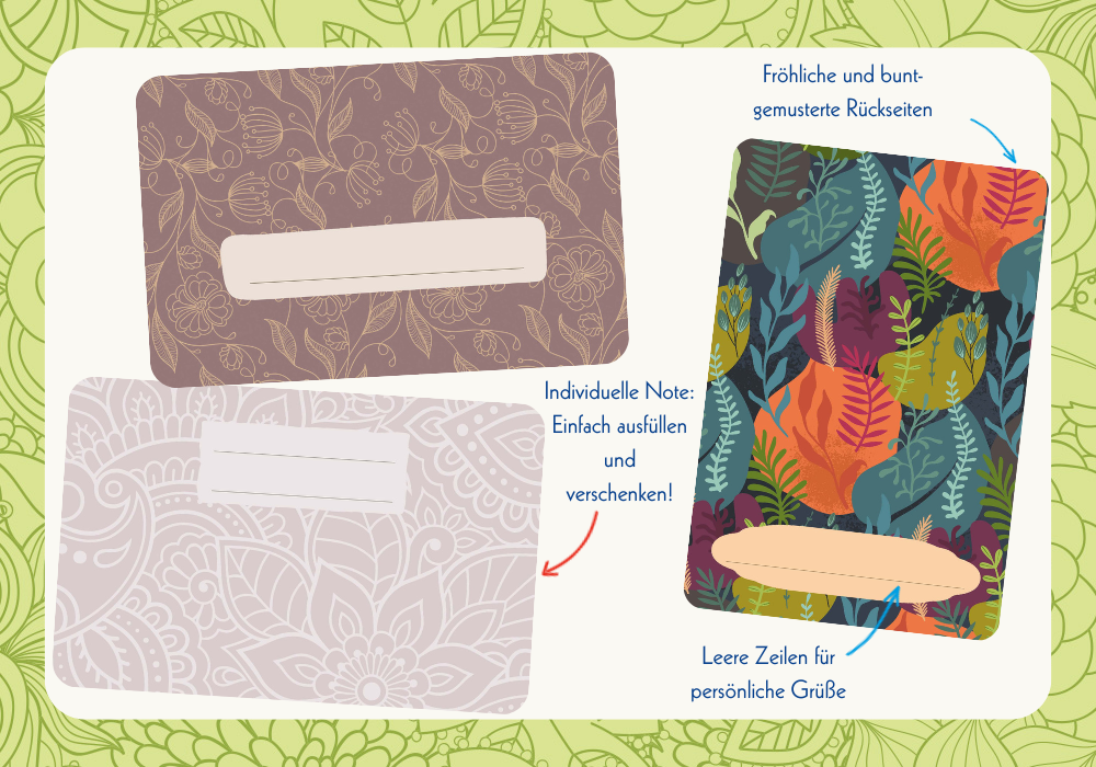 Die bunt gemusterten Rückseiten sind absolute Hingucker! Auf jeder Rückseite befindet sich ein Widmungsfeld für persönliche Grüße bieten. Anschließend können die fertig gestalteten Karten ganz einfach verschenkt werden! - Denn sie sind eine schöne Möglichkeit, jemandem eine kleine Freude zu machen. Für Familie und Freunde ein liebevoller Gruß und ein individuelles Geschenk. Darüber freut sich garantiert jeder!