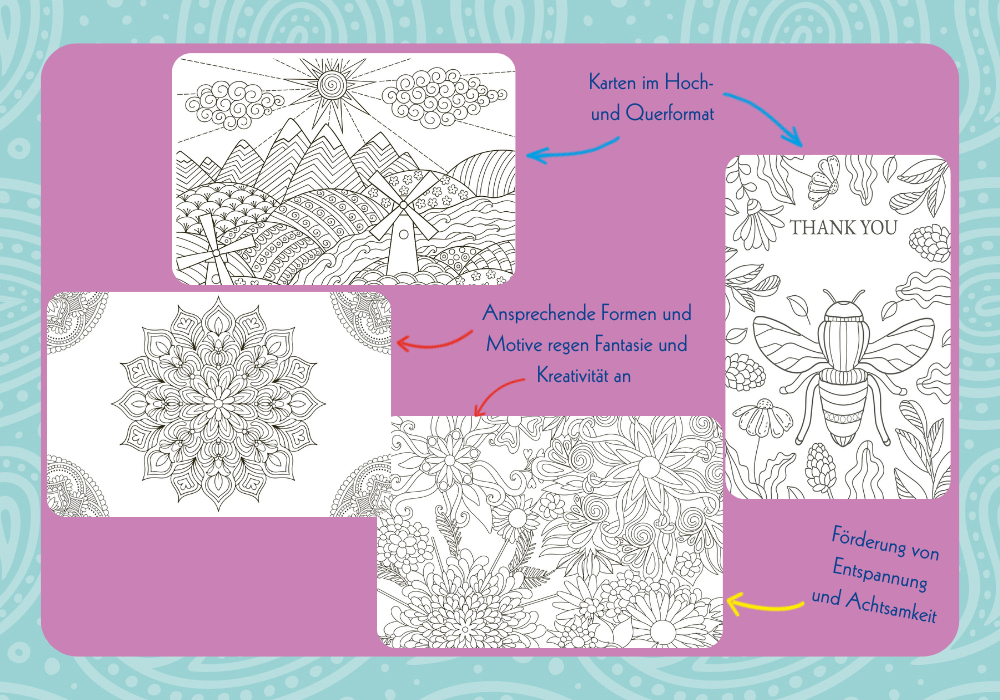 Einfach einen kleinen Time-out nehmen und die jeweils 50 Karten mit Farben zum Leben erwecken! Es warten klassische bis hin zu unkonventionellen Mandalas sowie "Liebe Grüße"-, Natur- und florale Motive in unterschiedlichen Schwierigkeitsstufen. Hier findet garantiert jeder (s)eine Lieblingskarte! Dabei wird die Fantasie gefördert, Mindfulness geübt und Achtsamkeit kann im Alltag einziehen. Ausgemalt werden können die Karten mit Bunt- und Filzstiften, Wachsmalkreide, sowie mit Aquarell-, Acryl- und Wasserfarben.