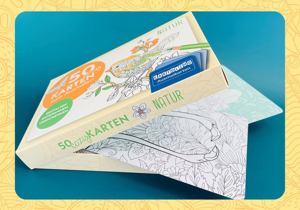 Die 50 cozy Ausmalkarten können ganz einfach in der Stülpdeckelschachtel verstaut werden. So geht keine Karte verloren! Aufgrund des handlichen Formats (16,6 x 10,8 cm) passt die Kartenbox in jede (Hand-)Tasche und ist bestens geeignet zum Mitnehmen! Auf langen Zugfahrten, im Urlaub, im Wartezimmer der Arztpraxis oder im Lieblingscafé – die bunten Ausmal- und zugleich Geschenkkarten sorgen immer und überall für eine entspannende, aber kreative Auszeit.