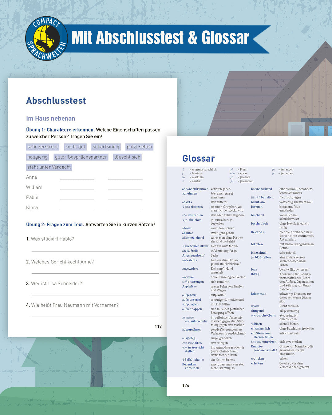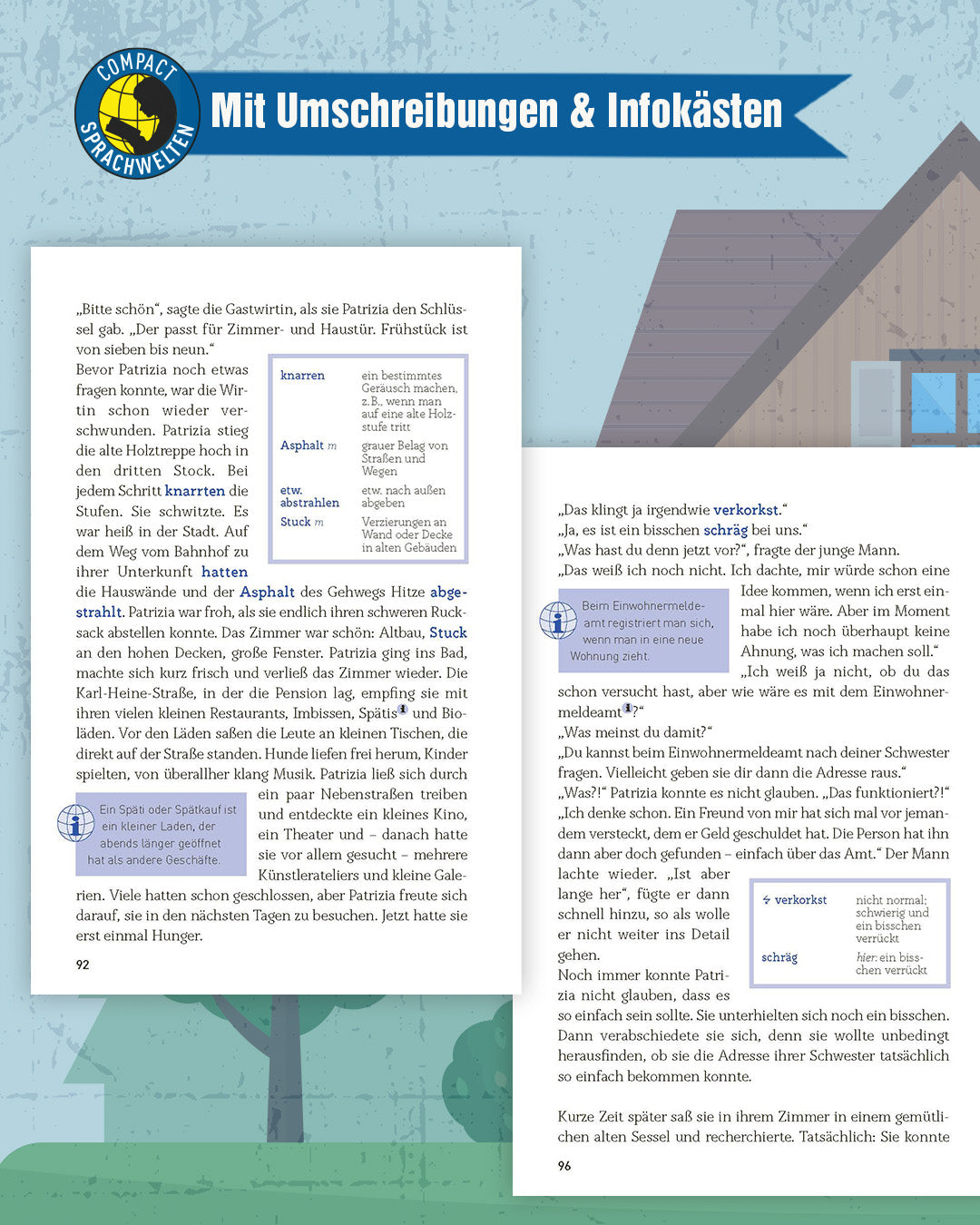 - Infokästen zu Sprache und Grammatik: Zusätzliche Informationen, Tipps und Wissenswertes zu Sprache, Grammatik und Landeskunde runden die Sprachwelten ab.