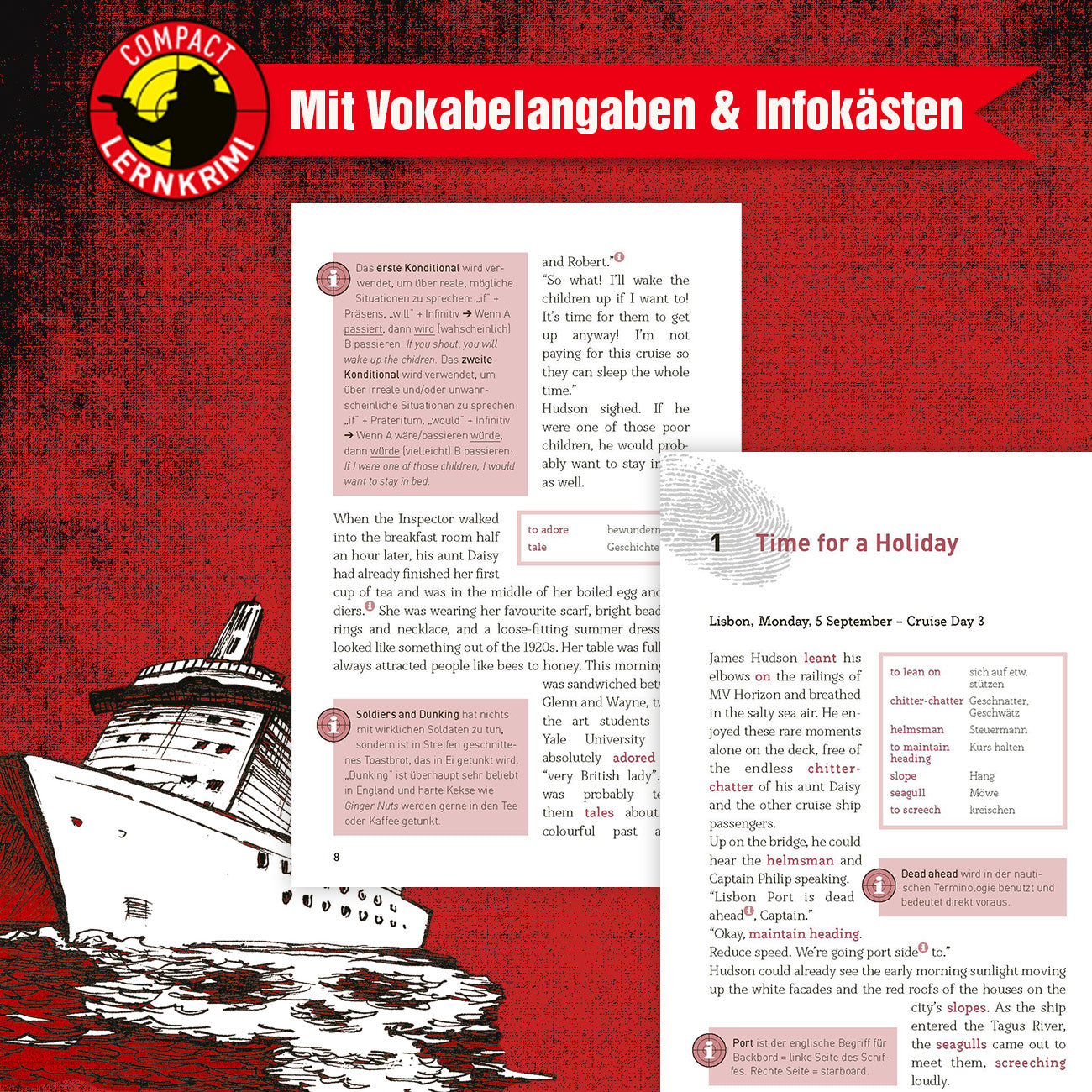 Inspector James Hudson steht an Deck eines großen Kreuzfahrtschiffes und schmollt. Nach einer Schussverletzung ist er dienstuntauglich und für sechs Wochen beurlaubt. Doch plötzlich wird an Board eine Leiche gefunden – und schon ist es mit der Erholung dahin … Hochspannung auf Englisch für Fortgeschrittene!