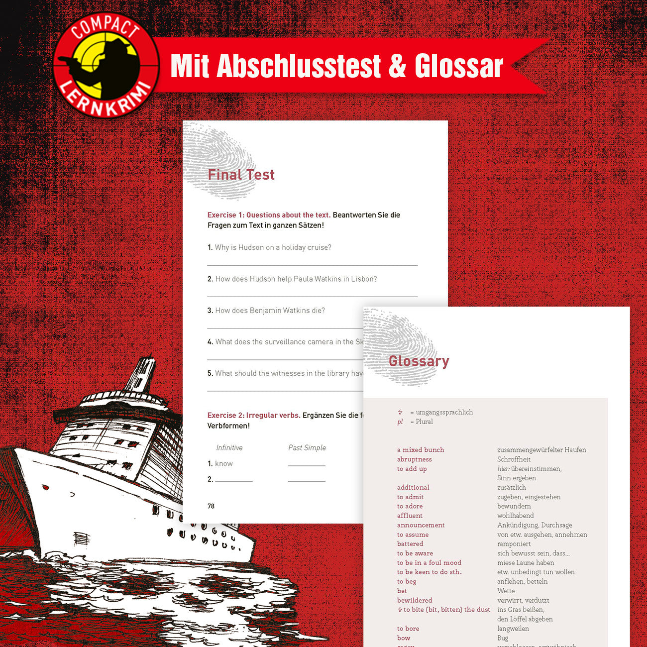 • Infokästen zu Sprache und Grammatik: Zusätzliche Informationen, Tipps und Wissenswertes zu Sprache, Grammatik und Landeskunde runden den Lernkrimi Classic „Death Ahead“ ab.