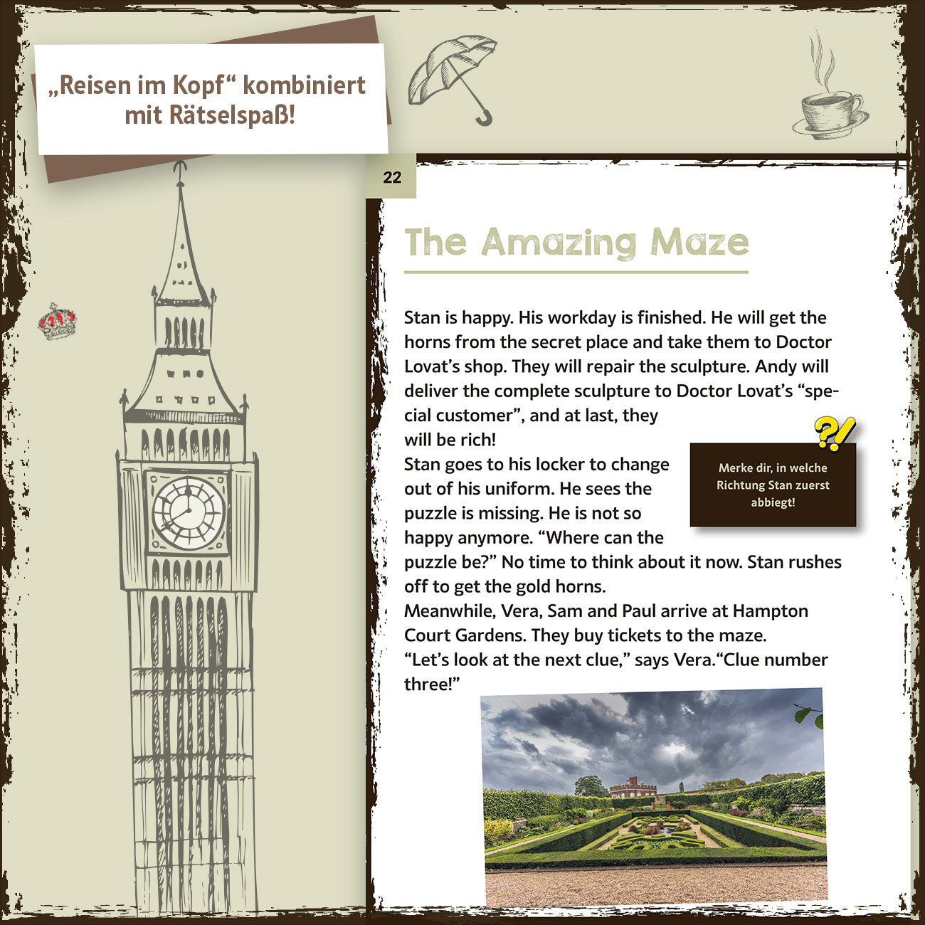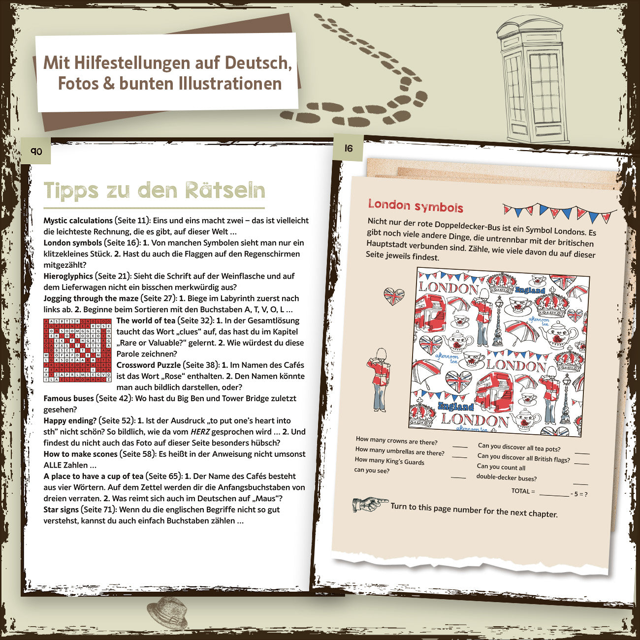 • Vokabelangaben auf jeder Seite & Tipps auf Deutsch: Die englischen Wörter, die über das Sprachniveau A1 hinausgehen, werden beim ersten Auftreten auf jeder Seite übersetzt und sind ohne umständliches Blättern sofort griffbereit. Immer wieder gibt es Tipps auf Deutsch, sodass die Rätsel leichter gelöst werden können und die Leser*innen erfahren, wie die Geschichte weitergeht. Falls man jedoch beim Knobeln mal nicht weiterkommt, finden sich auf Seite 90 Tipps, die den Leser*innen auf die Sprünge helfen. Für den Fall der Fälle gibt es auf Seite 91 zudem die Lösungen zu sämtlichen Rätseln.