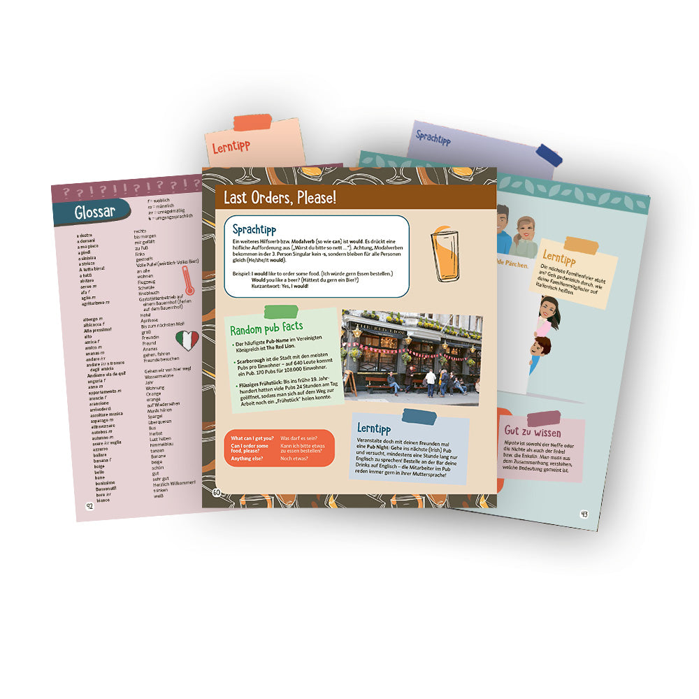 Und all diejenigen, die in die Sprache „hineinschnuppern“ möchten und keine Vorkenntnisse besitzen: Relevante fremdsprachliche Wörter werden in orangefarbenen Kästen übersetzt und alles zum Verständnis Wichtige wird auf Deutsch erklärt. Am Ende findet sich ein alphabetisches Glossar zum einfachen Nachschlagen der Vokabeln. In kurzen, übersichtlichen Grammatikboxen werden die wichtigsten Regeln vermittelt, beispielsweise zu Fragewörtern, Präpositionen, unregelmäßigen Verben, ect. Immer wieder sind Sprach- und Lerntipps in kunterbunten Kästen zu finden.