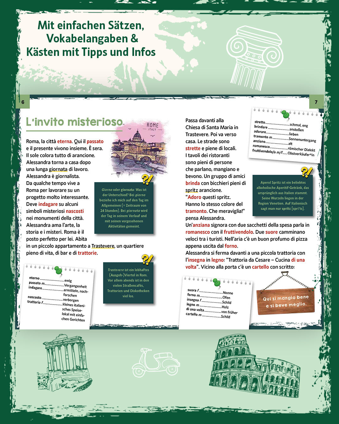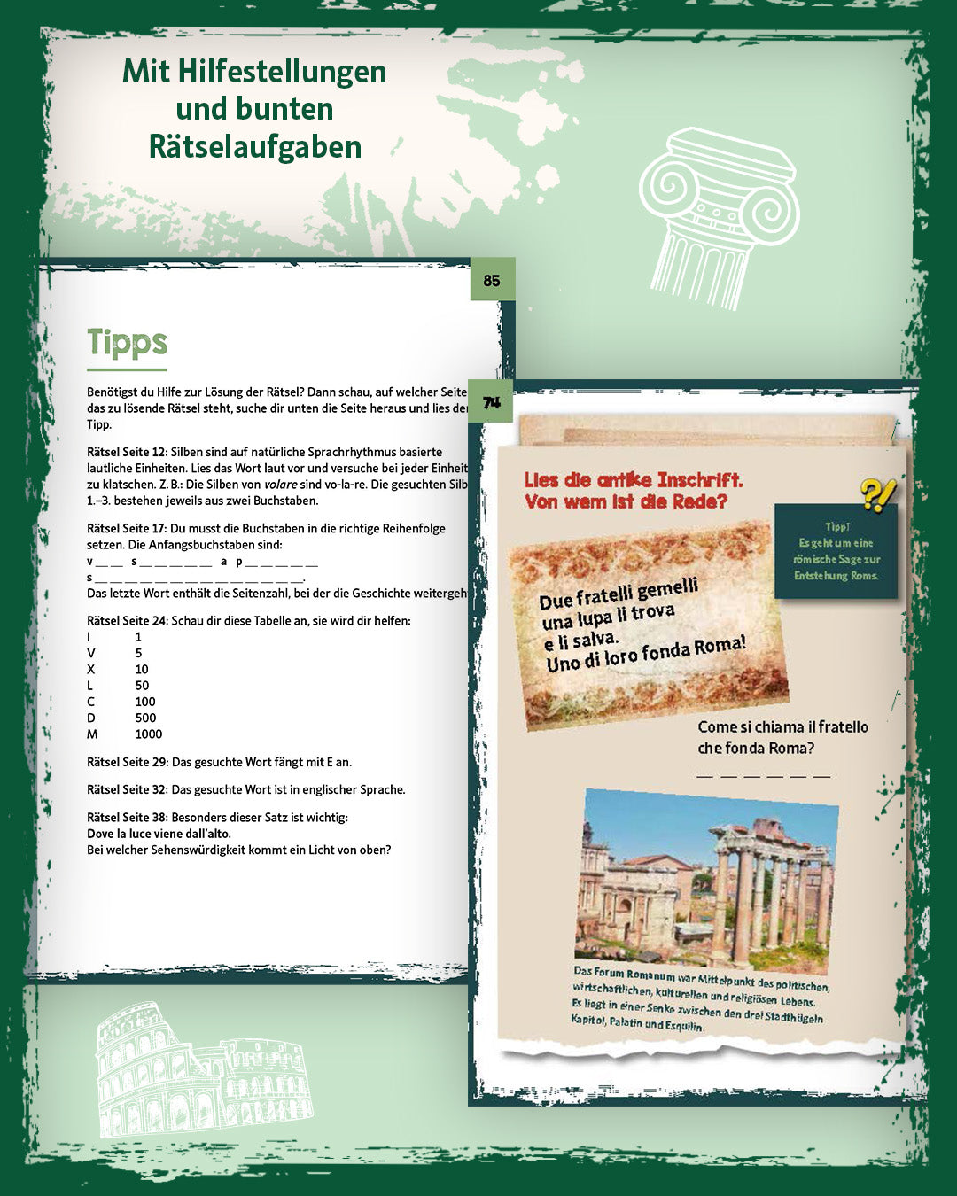 - Vokabelangaben auf jeder Seite & Tipps auf Deutsch: Die italienischen Wörter, die über das Sprachniveau A2 hinausgehen, werden beim ersten Auftreten auf jeder Seite übersetzt und sind ohne umständliches Blättern sofort griffbereit. Immer wieder gibt es Tipps auf Deutsch, sodass die Rätsel leichter gelöst werden können und die Leser*innen erfahren, wie die Geschichte weitergeht. Falls man jedoch beim Knobeln mal nicht weiterkommt, finden sich auf Seite 85 Tipps, die den Leser*innen auf die Sprünge helfen. Für den Fall der Fälle gibt es auf Seite 86 zudem die Lösungen zu sämtlichen Rätseln.