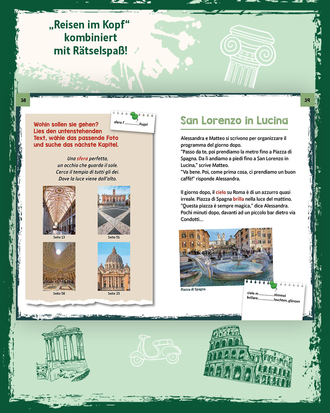 - Hoher Unterhaltungswert: Die rund 20 abwechslungsreichen Rätsel bringen jede Menge Spaß beim Lesen, die vielen farbigen Illustrationen veranschaulichen die Story und führen die Leser*innen in die ewige Stadt.