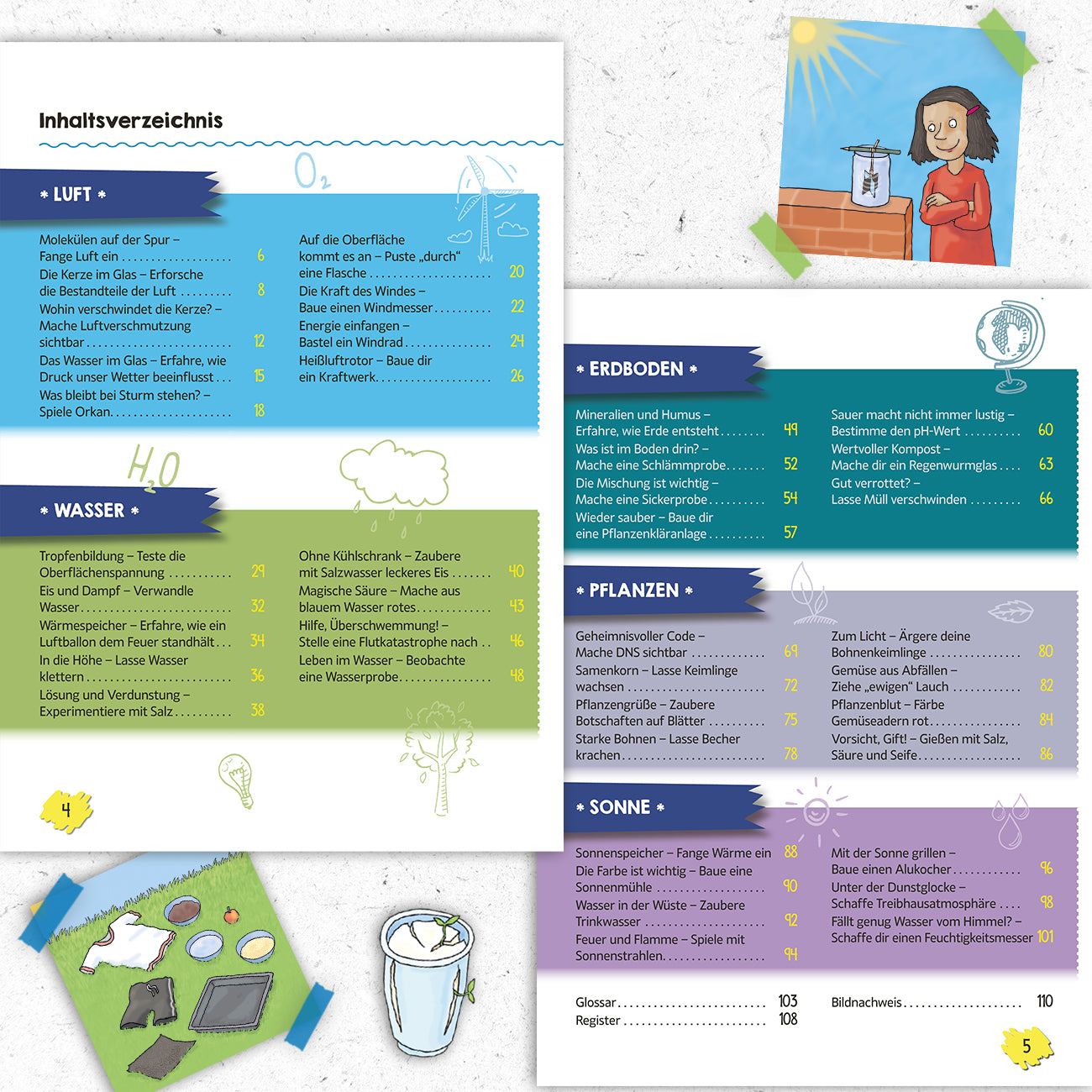 Aufgeteilt sind die Experimente in folgende Kapitel: Experimente mit Luft, Wasser, Pflanzen, Sonnenlicht und mit dem Erdboden. Mit wenig Aufwand und mit Hilfsmitteln, die man meist zu Hause hat, sind die vollkommen ungefährlichen Experimente ganz einfach nachzumachen. Anschauliche Illustrationen und leicht verständliche Anleitungen helfen den Experimentierfreudigen bei der Durchführung und sorgen für sicheres Gelingen. Mit diesen spannenden Umwelt-Experimenten können Kinder alles, was in der Natur passiert, hautnah erleben und entdecken!