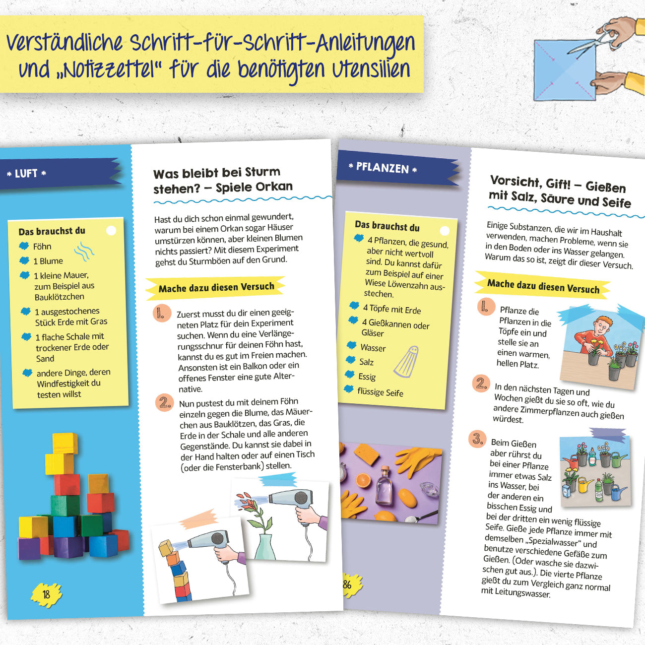 Für Kinder gibt es in der Natur so viel zu entdecken und zu erforschen: Was ist im Boden drin? Welcher Müll verrottet, welcher nicht? Aber auch alltägliche Phänomene wie die Frage, wohin die Kerze verschwindet, wenn sie brennt, machen wissensbegierige Kids neugierig! Die „Umwelt-Experimente: Natur hautnah erleben!“ liefern kindgerechte Antworten auf diese und viele weitere Fragen aus dem Bereich Umwelt! Wichtige Umweltthemen werden Kindern ab 8 Jahren hier in 40 Experimenten „erlebbar“ erklärt und mit Bezug zum topaktuellen Thema Umweltschutz dargestellt. Und ganz nebenbei werden den jungen Naturwissenschaftler*innen die physikalischen, biologischen und chemischen Grundlagen unseres Alltags nahegebracht.