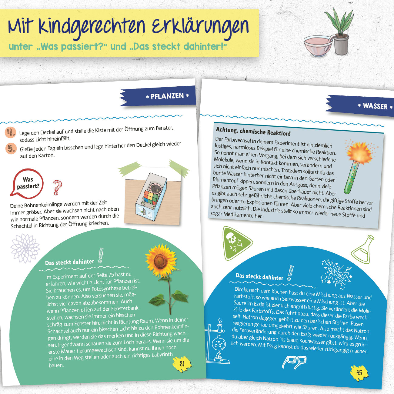 - 40 spannende und einfache Experimente: stellen Themen aus dem Bereich Umwelt „erlebbar“ dar. Und ganz nebenbei werden die physikalischen, biologischen und chemischen Grundlagen unseres Alltags kindgerecht erklärt.