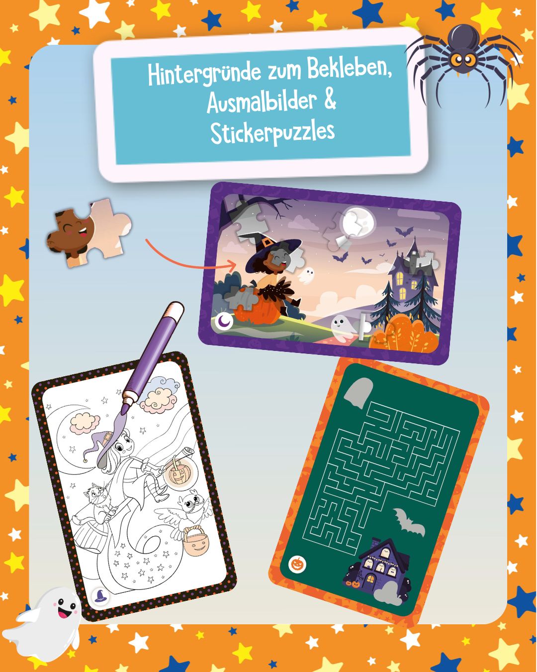 - 30 Karten voller gruselspaßiger Motive: Auf jeder Vorderseite findet sich ein farbenfrohes Puzzle, ein liebevoll gestalteter Hintergrund oder ein kniffliges Rätsel. Ein Teil der Karten kann auch noch selbst fertig ausgemalt werden.