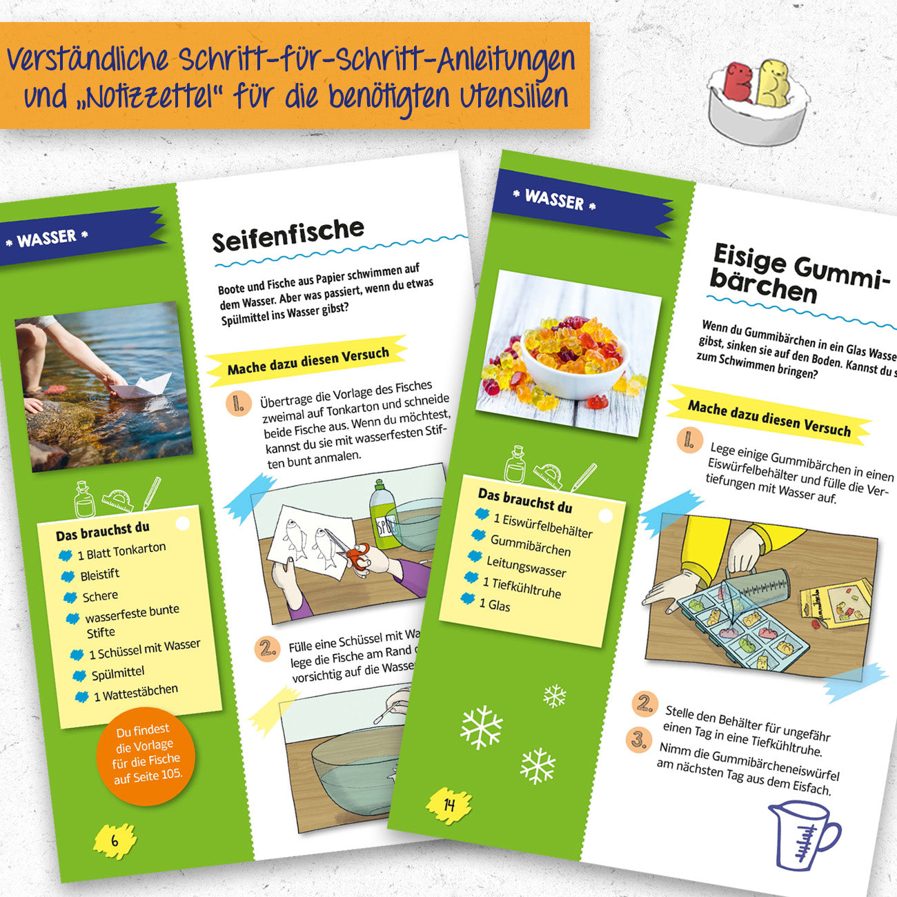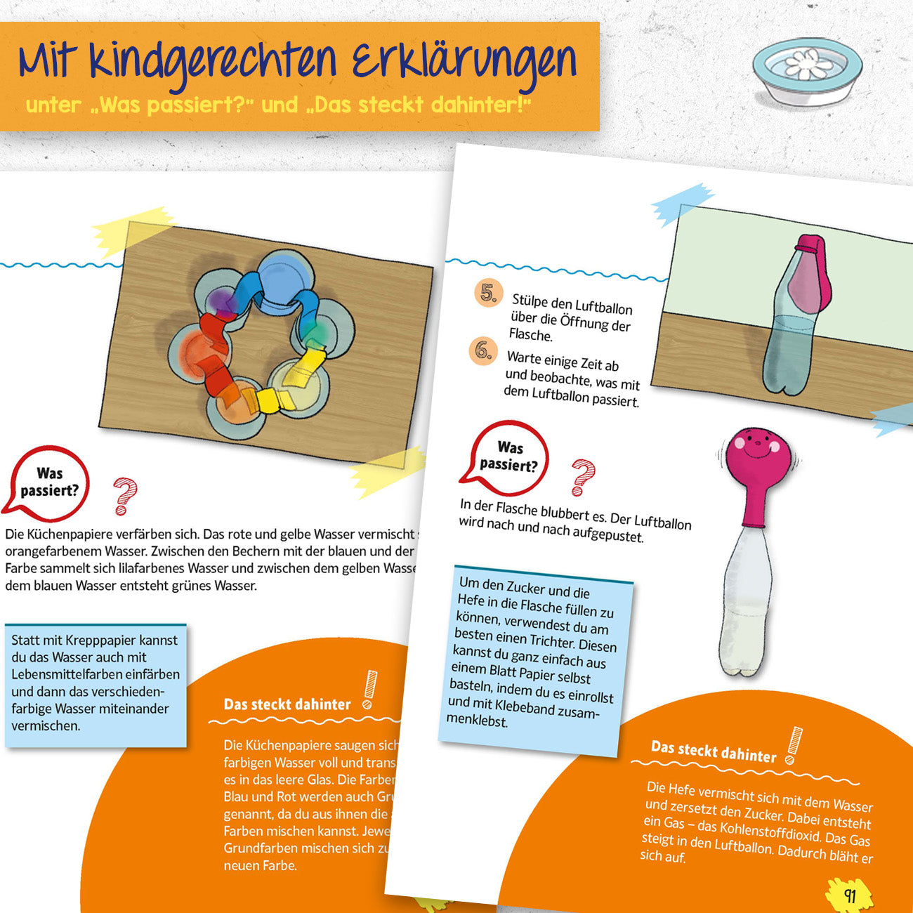- Mit einfachen Mitteln, wenig Aufwand und großem Effekt: Die Experimente schaffen bereits im Vorschulalter spielerisch Zugang zur Naturwissenschaft und stillen den Wissenshunger der experimentierfreudigen Kids.