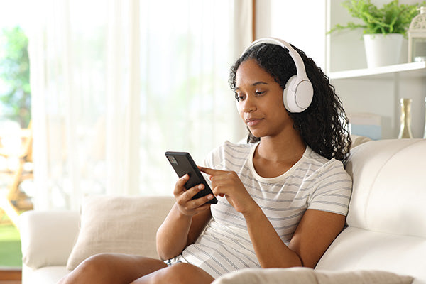 shutterstock.com: Pheelings media (Frau auf Sofa mit Kopfhörer und Smartphone)