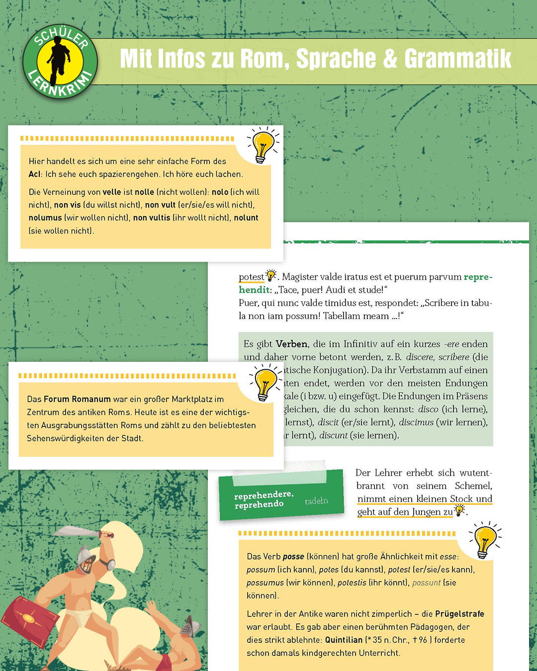 - Infokästen zu Sprache und Grammatik: liefern zusätzliche Informationen zu Landeskunde über das Römische Reich und zu sprachlichen Eigenheiten.