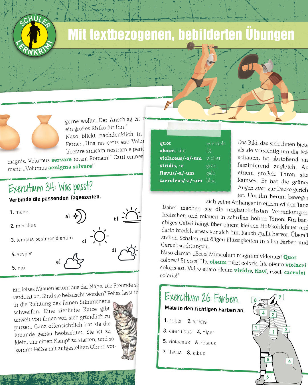 - Bebilderte Übungen: Die teilweise bebilderten Übungen dienen zur Veranschaulichung der Geschichte. Durch den hohen Deutschanteil ist diese einfach zu verstehen. Nach und nach nehmen die lateinischen Textpassagen zu.