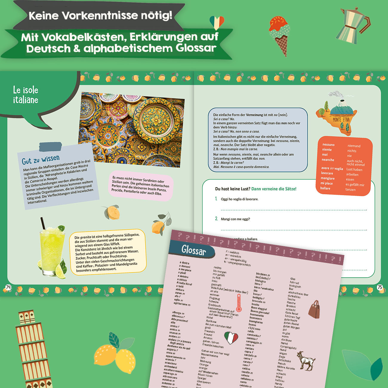 - Vokabelangaben & Tipps auf Deutsch: Relevante italienische Wörter werden in orangefarbenen Kästen übersetzt und alles zum Verständnis Wichtige wird auf Deutsch erklärt. Immer wieder gibt es hilfreiche Lerntipps in Form von eingestreuten Boxen. Am Ende findet sich ein alphabetisches Glossar zum einfachen Nachschlagen der gelernten Wörter.