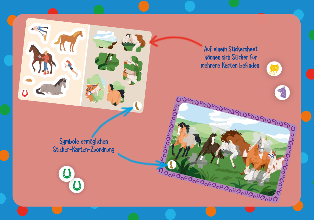 Jede Karte hat ein Symbol, mit dessen Hilfe sich ganz leicht die passenden Stickermotive finden. Zu den verschiedenen Themen passende Symbole wie beispielsweise Hufeisen, Dinoeier oder Farbklekse in unterschiedlichen Farben machen die Zuordnung ganz einfach. Auf einem Stickersheet können sich die Sticker für bis zu drei Karten befinden.