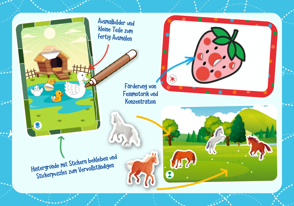 Hier werden bunte und zum Lieblingsthema passende Hintergründe und Landschaften beklebt! Es gilt Rätsel wie Labyrinthe zu lösen, Puzzles und Stickerbilder zu vervollständigen und manche davon im Anschluss fertig auszumalen! Bei den Karten Erste Farben müssen zusätzlich Sticker in derselben Farbe auf die farblich passende Karte gestickert werden. Beim Stickern werden ganz nebenbei Feinmotorik und Konzentration trainiert, es sorgt für Entspannung und der Kreativität sind dabei keine Grenzen gesetzt!