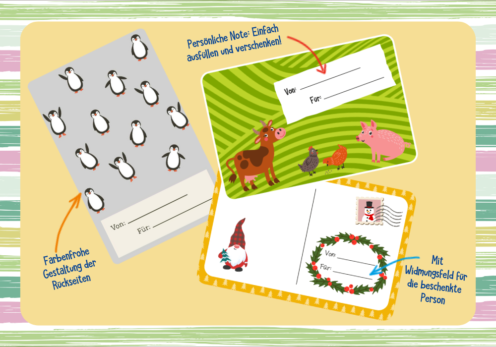 Auf den individuell gestalteten Kartenrückseiten ist ein Widmungsfeld zu finden. In die Zeile "Von" kann der Name der kleinen Künstlerin bzw. des kleinen Künstlers eingetragen werden, in die Zeile "Für" der Name der beschenkten Person. Für Familie und Freunde sind die gestickerten Meisterwerke eine liebevolle Grußkarte und ein tolles Geschenk.