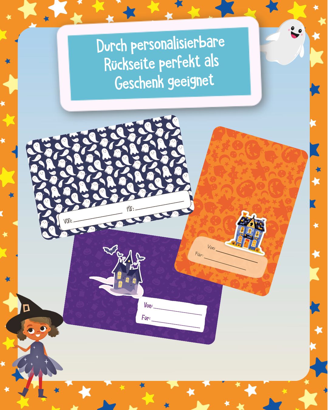 Perfekt auch für die nächste Halloweenparty! Mit niedlichen Geistern oder frechen Hexen durch die Nacht fliegen, bunte Süßigkeiten sammeln und die richtigen Zutaten in den Hexenkessel geben – die 150 Sticker machen die Karten zu bunten Meisterwerken, die sich perfekt zum Verschenken eignen. Auf jeder Kartenrückseite befindet sich ein Widmungsfeld, in das die Namen der Künstlerin oder des Künstlers sowie der beschenkten Person eingetragen werden können. Über dieses individuell gestaltete Mitbringsel freuen sich Familienmitglieder und Freunde garantiert.