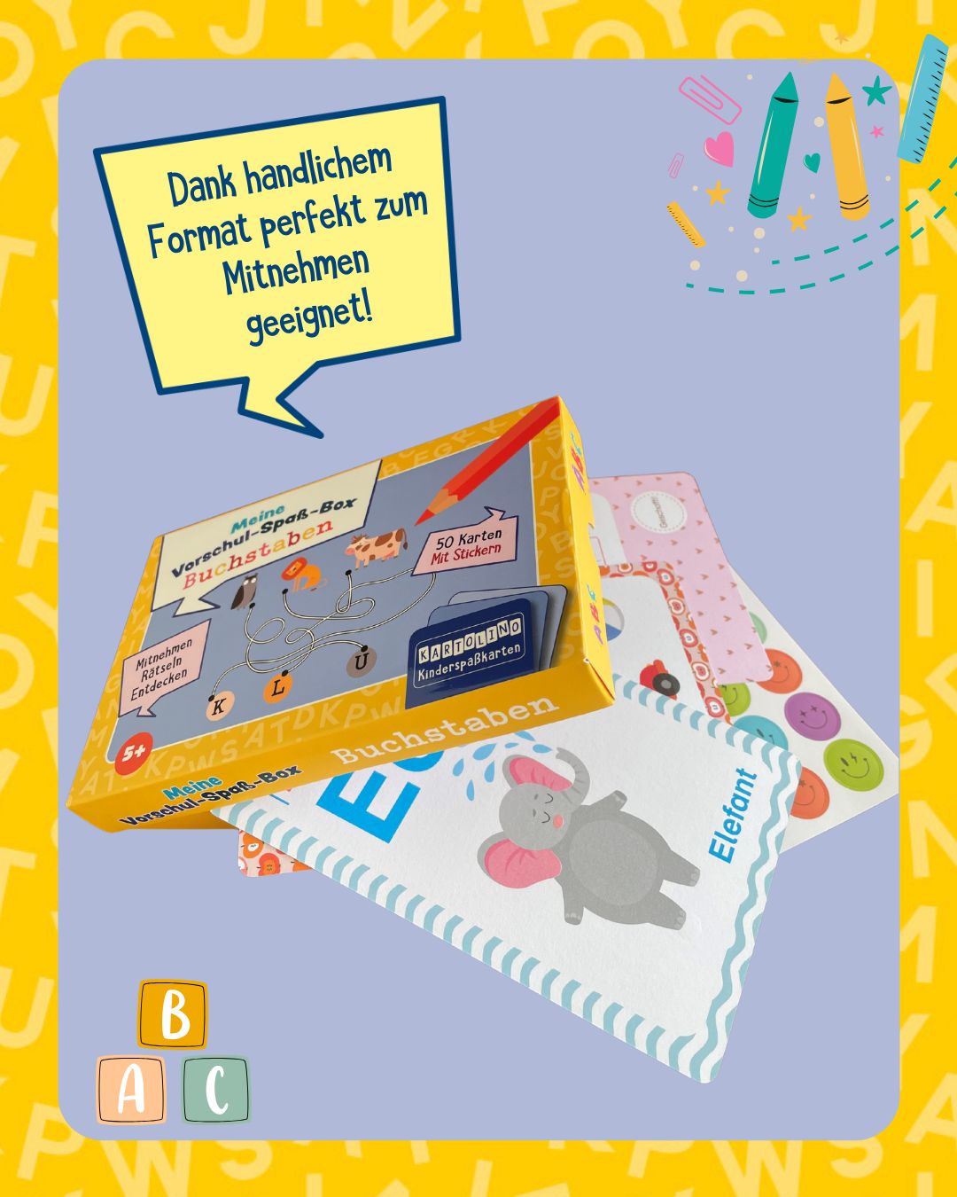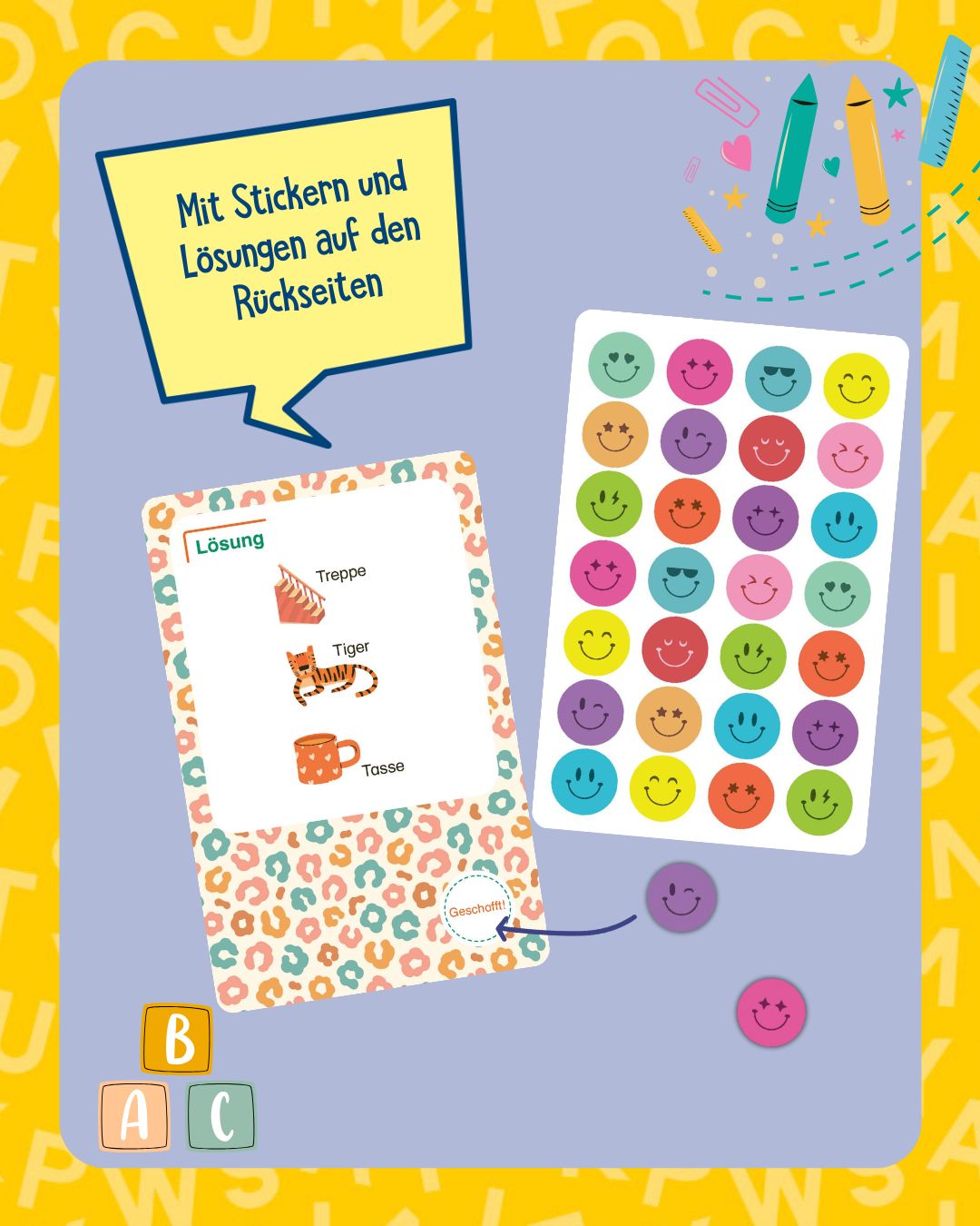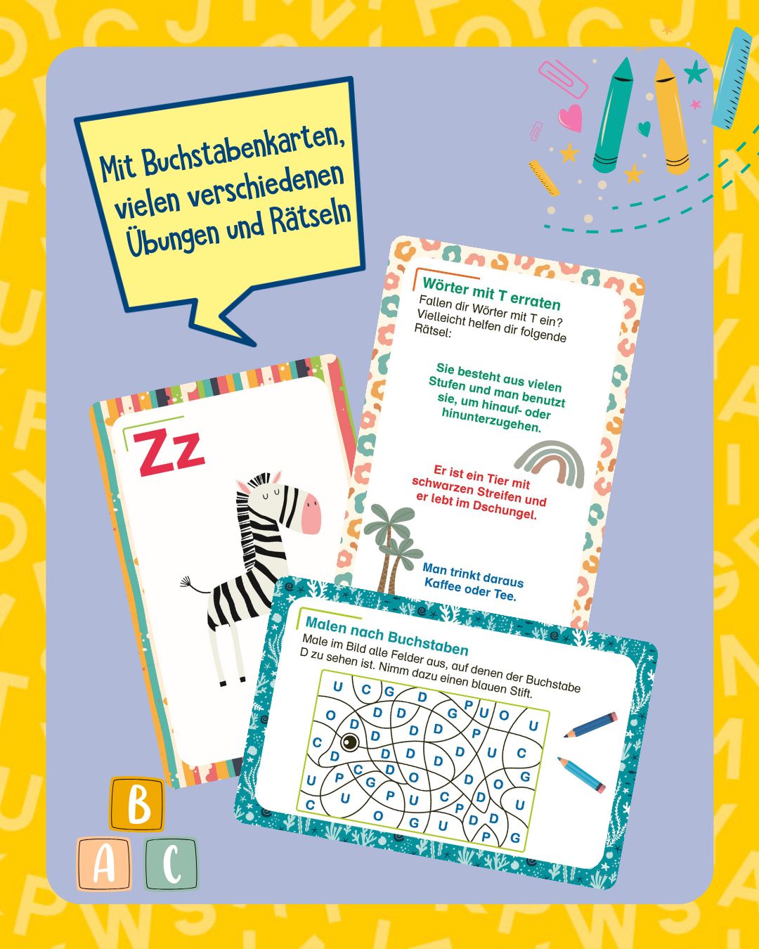 - 50 Karten voller bunter Buchstabenrätsel: Auf jeder Vorderseite wartet eine altersgerechte Aufgabe.