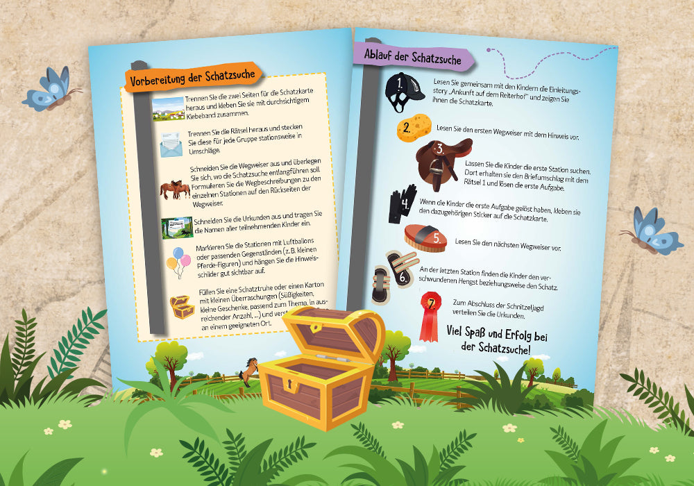 Außerdem mitgeliefert werden thematisch gestaltete Wegweiser zu den Stationen und eine große Schatzkarte zum Zusammensetzen, auf die die Kinder nach jeder erfolgreich absolvierten Station einen Sticker kleben dürfen.