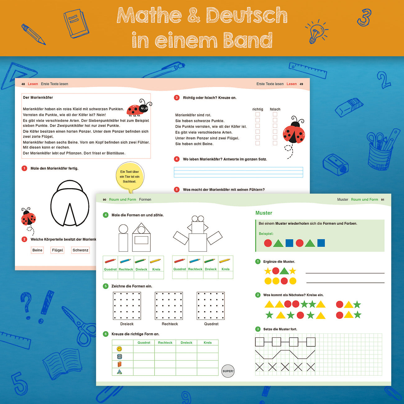 Die Titel der Reihe „Lückenlos ins nächste Schuljahr“ kombinieren kindgerechte Erläuterungen mit vielfältigen Aufgaben zu den Fächern Deutsch und Mathe. Der Schwerpunkt wird dabei jeweils auf die Themen gelegt, die in der Folgeklasse Voraussetzung für weitere Lernerfolge sind. Die Übungshefte können dazu dienen, am Ende des Schuljahres oder in den großen Ferien den Stoff des vergangenen Jahres zu wiederholen. Sie eignen sich aber auch als Begleiter während des laufenden Schuljahres. Der gesamte Schulstoff des ersten Grundschuljahres in den Fächern Deutsch und Mathematik wird hier abgedeckt. Im Fach Deutsch werden u.a. Laute und Silben sowie Nomen und Großeschreibung am Satzanfang behandelt. Im Fach Mathematik drehen sich die Übungen um erste Plus- und Minusaufgaben, die Darstellung der Zahlen bis 20, erste Formen und vieles mehr. Ist eine Lerneinheit durchgearbeitet, darf ein Sticker in den dafür vorgesehenen Kreis am Ende der Doppelseite geklebt werden.