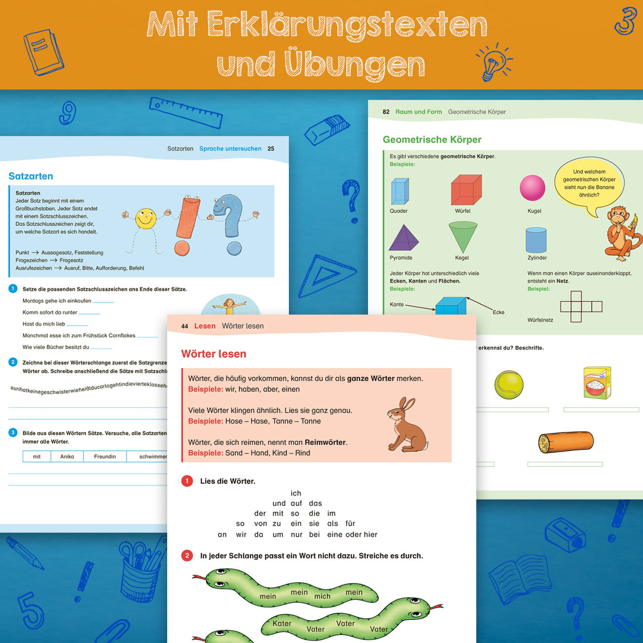 - Kindgerecht aufbereitetes Wissen: Alle relevanten Lerninhalte der Hauptfächer Mathematik und Deutsch werden kurz erklärt. Zusätzlich geben kleine Äffchen praktische Tipps zum Lösen der Aufgaben.