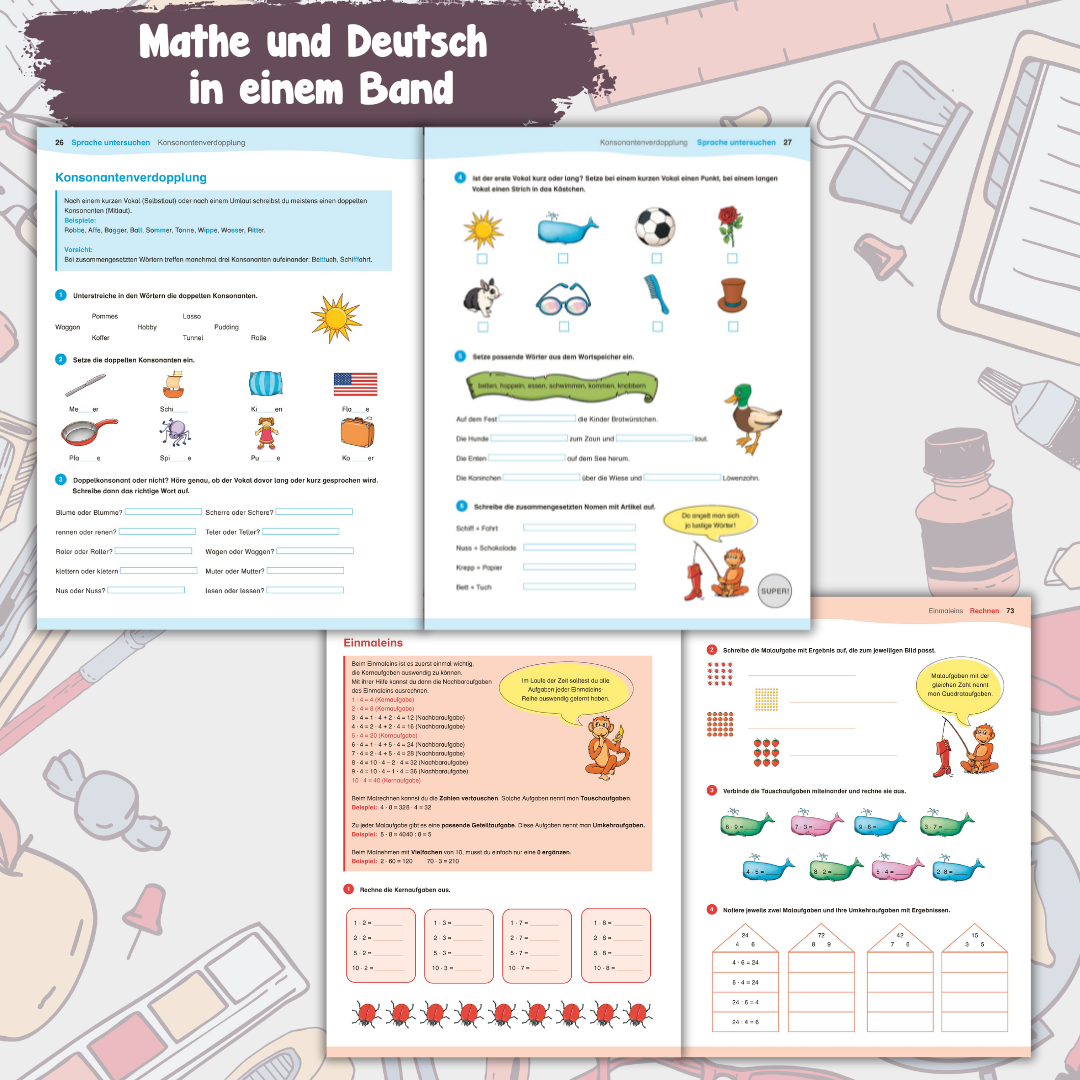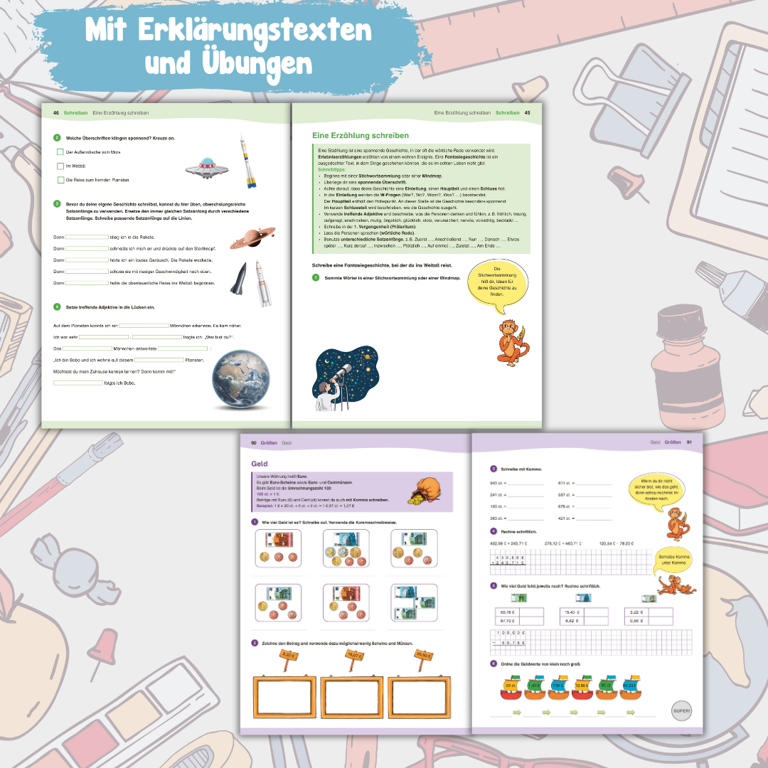• Kindgerecht aufbereitetes Wissen: Alle relevanten Lerninhalte der Hauptfächer Mathematik und Deutsch werden kurz erklärt. Zusätzlich geben kleine Äffchen praktische Tipps zum Lösen der Aufgaben.