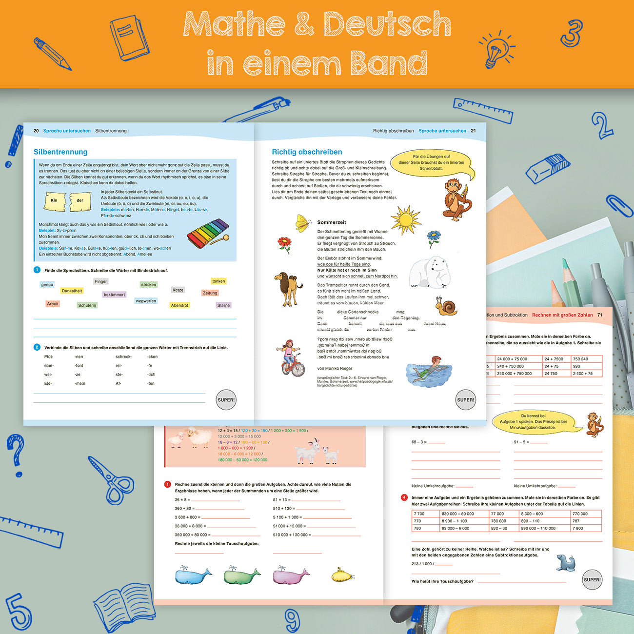 Die Titel der Reihe „Lückenlos ins nächste Schuljahr“ kombinieren kindgerechte Erläuterungen mit vielfältigen Aufgaben zu den Fächern Deutsch und Mathe. Der Schwerpunkt wird dabei jeweils auf die Themen gelegt, die in der Folgeklasse Voraussetzung für weitere Lernerfolge sind. Die Übungshefte können dazu dienen, am Ende des Schuljahres oder in den großen Ferien den Stoff des vergangenen Jahres zu wiederholen. Sie eignen sich aber auch als Begleiter während des laufenden Schuljahres. Der wesentliche Schulstoff des vierten Grundschuljahres in den Fächern Deutsch und Mathematik wird hier abgedeckt. Im Fach Deutsch werden u.a. die Wortarten sowie die Bestimmung der Satzglieder behandelt. Aber auch wichtige Aufsatzformen und das sinnerfassende Lesen kommen nicht zu kurz. Im Fach Mathematik drehen sich die Übungen um die schriftlichen Verfahren zur Multiplikation und Division sowie das Lösen von Sachaufgaben und vieles mehr. Ist eine Lerneinheit durchgearbeitet, darf ein Sticker in den dafür vorgesehenen Kreis am Ende der Doppelseite geklebt werden.Das hält das Übungsheft für die 4. Klasse bereit: