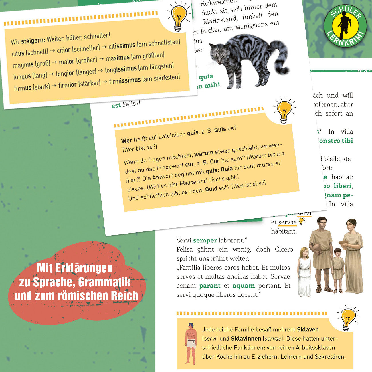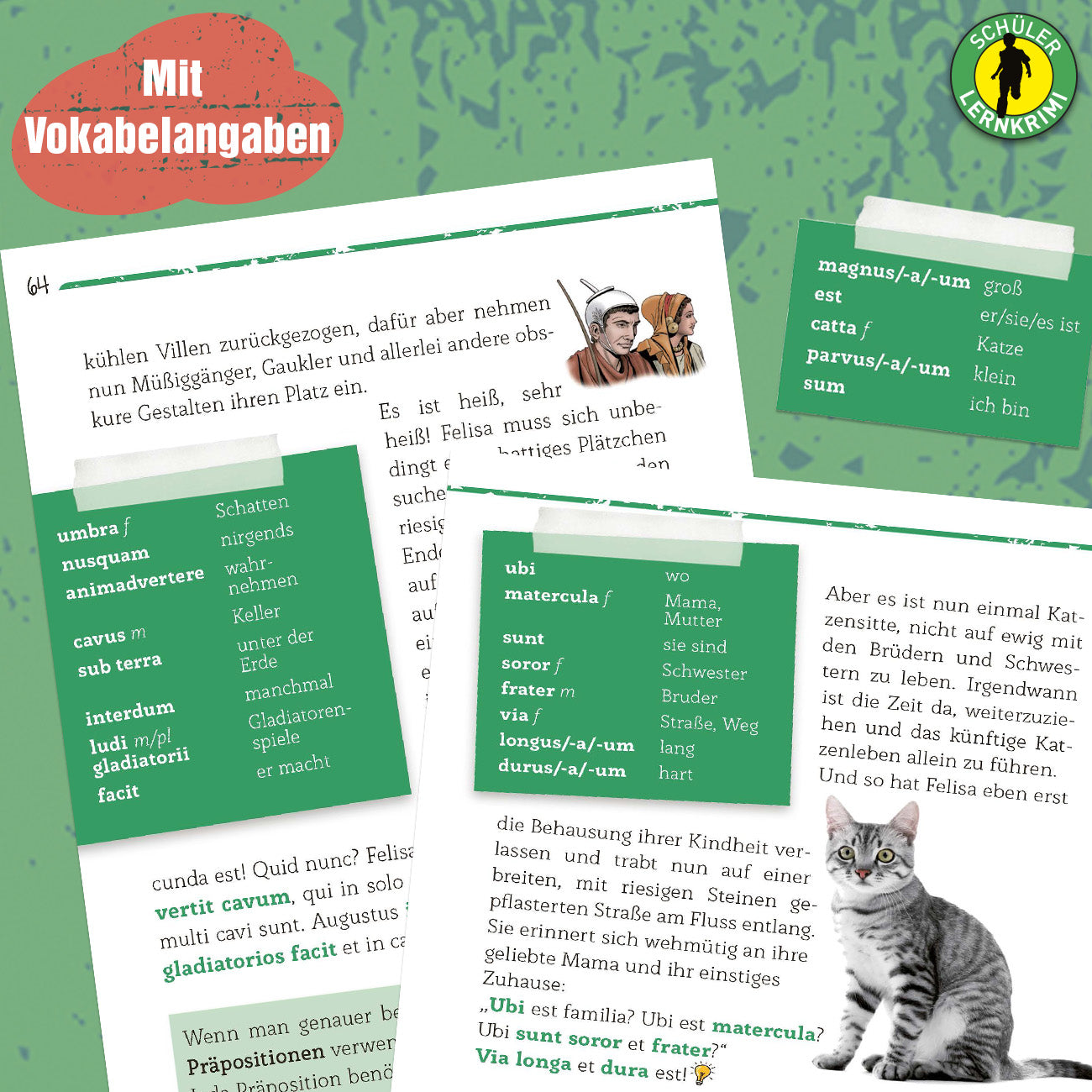 Ihr Kind hat das erste Jahr Lateinunterricht? Sie sind auf der Suche nach einer spannenden Lateinlektüre, die zusätzlich zur Schule gelesen werden kann und dabei jede Menge Spaß bringt? Die Reihe der Schüler-Lernkrimis folgt in Aufbau und Konzept der bewährten und erfolgreichen Reihe „Lernkrimi“. Die vorliegende Geschichte ist vorwiegend in Deutsch geschrieben, nach und nach kommen jedoch immer mehr lateinische Textpassagen hinzu. Der Schüler-Lernkrimi führt die jungen Leser*innen mit einfachen Wortschatz- und Grammatikerklärungen zur lateinischen Sprache hin und unterstützt sie beim Lernen. „Felisa et secreta Romae“ ist eine mitreißende Geschichte der sympathischen Straßenkatze Felisa, die von einer didaktisch versierten Latein-Fachkraft verfasst wurde und bis zum Schluss Spannung bietet. Innerhalb der einzelnen Kapitel gibt es didaktisch aufbereitete, textintegrierte, meist bebilderte Übungen. Die lateinischen Wörter werden beim ersten Auftreten in Vokabelkästen direkt auf der Seite übersetzt und Infokästen liefern zusätzliche Informationen über das römische Reich und zu sprachlichen Eigenheiten. Die Schüler-Lernkrimis sorgen für Spannung beim Lesen und schnelle Erfolgserlebnisse beim Sprachenlernen!