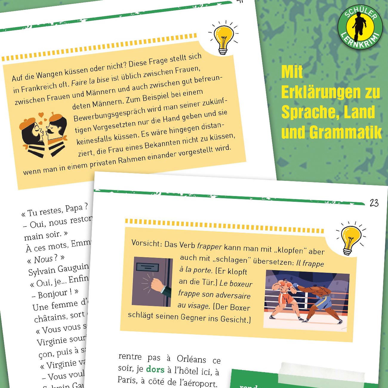 - Infokästen zu Sprache und Grammatik: Zusätzliche Infos, Tipps und Wissenswertes zu Sprache, Grammatik und Landeskunde ergänzen den Schüler-Lernkrimi „Un Grand Secret“.