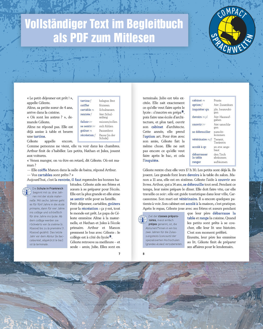 Die Reihe Sprachwelten Hörbücher sorgt für positive Erfahrungen beim Lesen und Hören der französischen Sprache und erleichtert spielerisch den Spracherwerb. Die Sprachwelten Hörbücher sind in den Sprachen Englisch, Französisch, Spanisch, Italienisch und Deutsch erhältlich.