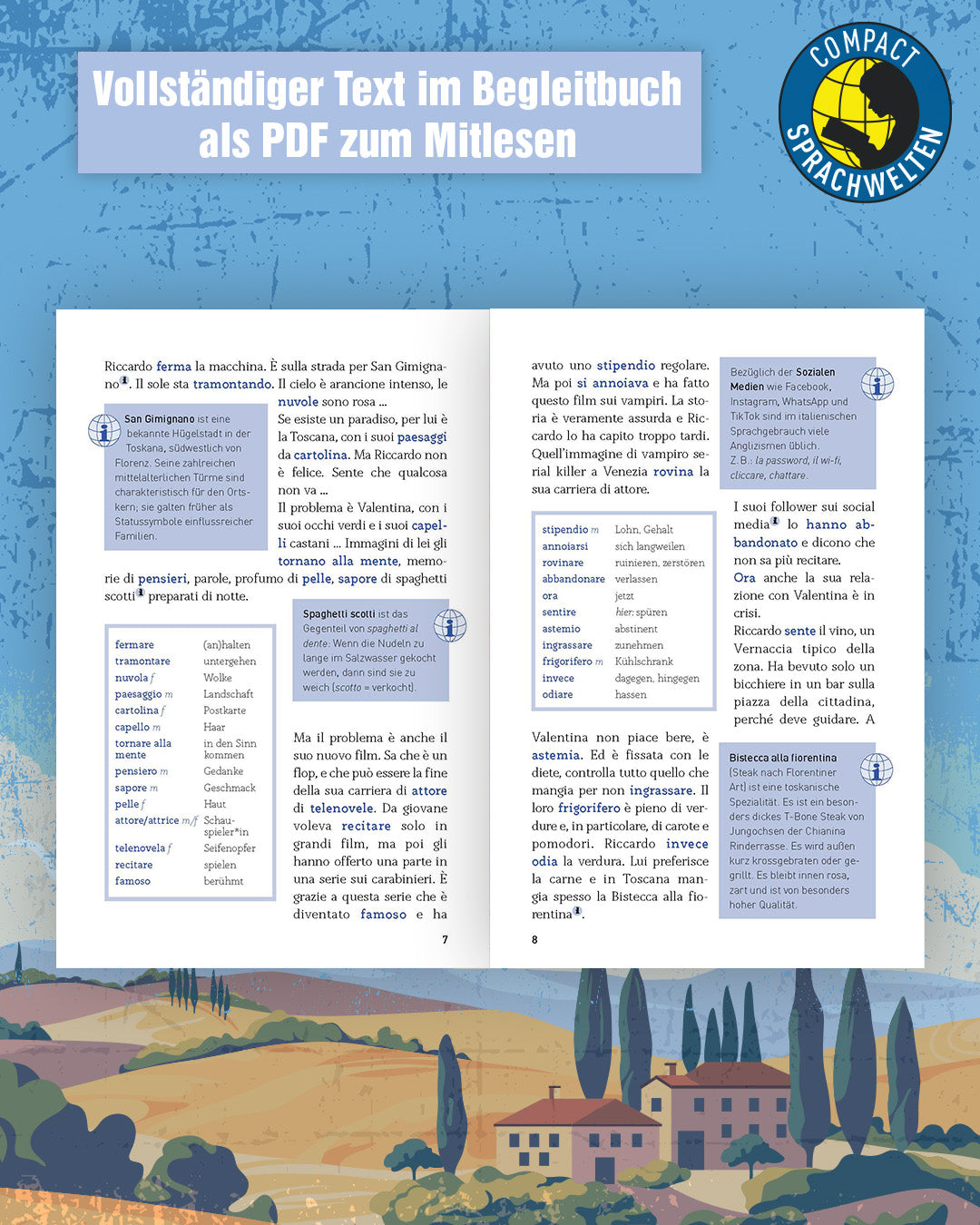 - Unterhaltsame Kurzgeschichte auf Italienisch: Die Sprachwelten entführen mit alltäglichen Geschichten nach Italien. Die Hörer*innen dieser Kurzgeschichte lernen die Region Toskana kennen.