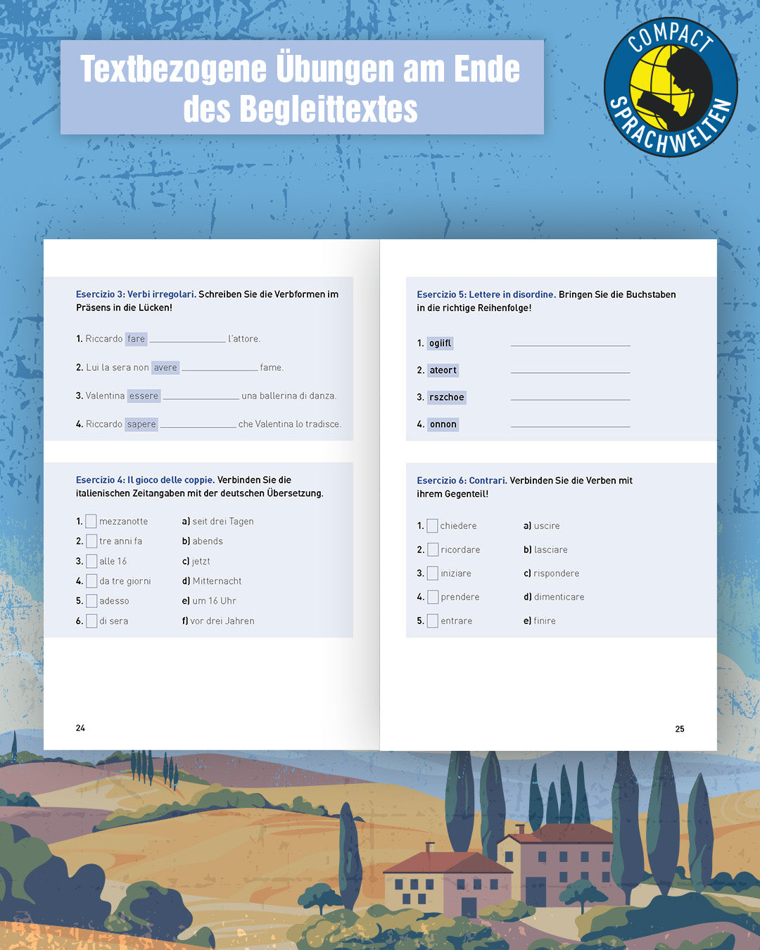 Die Reihe Sprachwelten Hörbücher sorgt für positive Erfahrungen beim Lesen und Hören der italienischen Sprache und erleichtert spielerisch den Spracherwerb. Die Sprachwelten Hörbücher sind in den Sprachen Englisch, Französisch, Spanisch, Italienisch und Deutsch erhältlich.