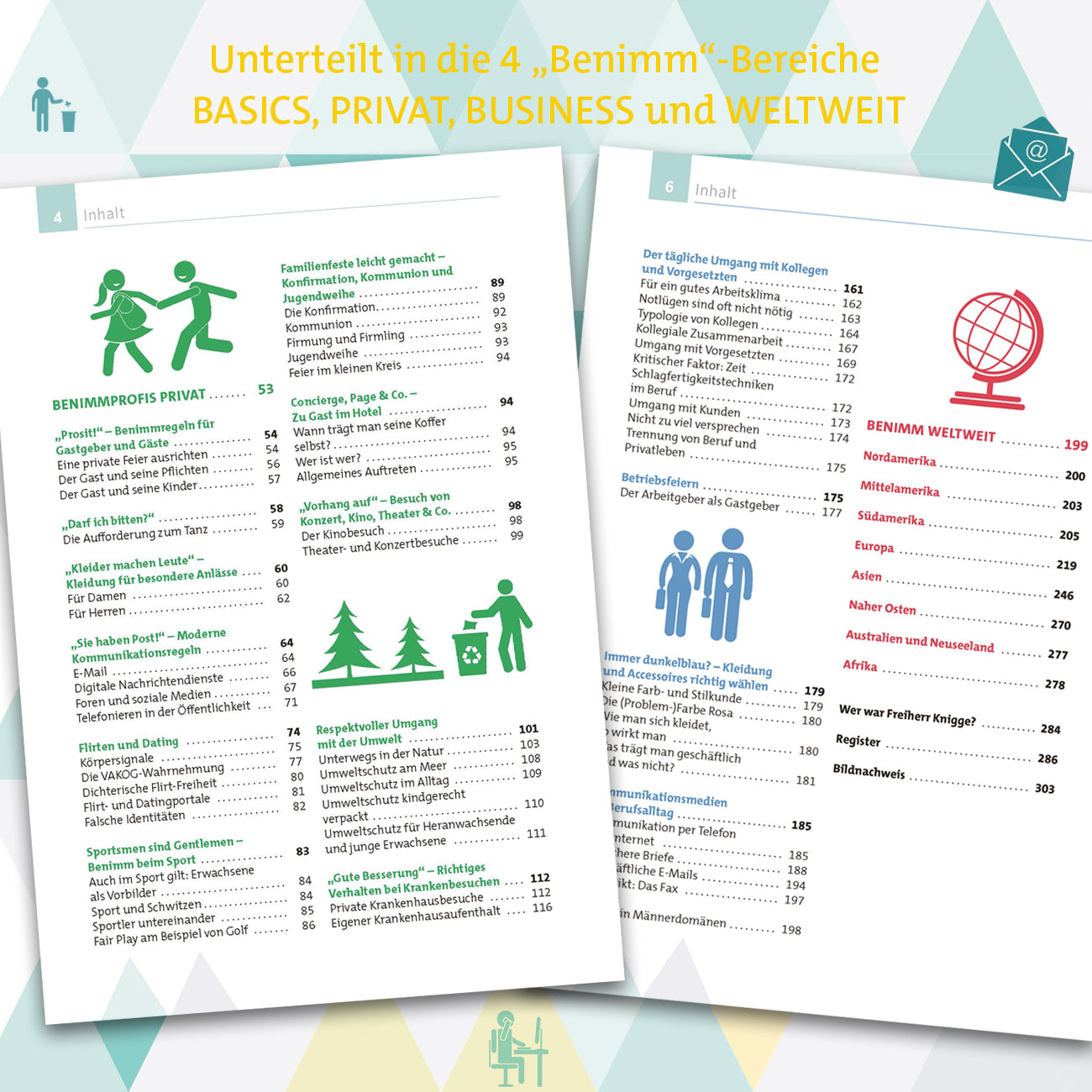 Dieser umfangreiche Ratgeber klärt über die wichtigsten und richtigen Umgangsformen sowohl im privaten als auch im beruflichen Umfeld auf und ist somit der Schlüssel zum Erfolg. Die Benimm-Expertin Silke Schneider-Flaig gibt auf 304 Seiten Tipps für ein stets souveränes und korrektes Auftreten mit an die Hand: Wie betreibt man Smalltalk, ohne dabei in ein Fettnäpfchen zu treten? Wie verhält man sich richtig bei Tisch? Und was sind absolute No-Gos im Geschäftsleben, insbesondere in Zeiten von Homeoffice und Co.?